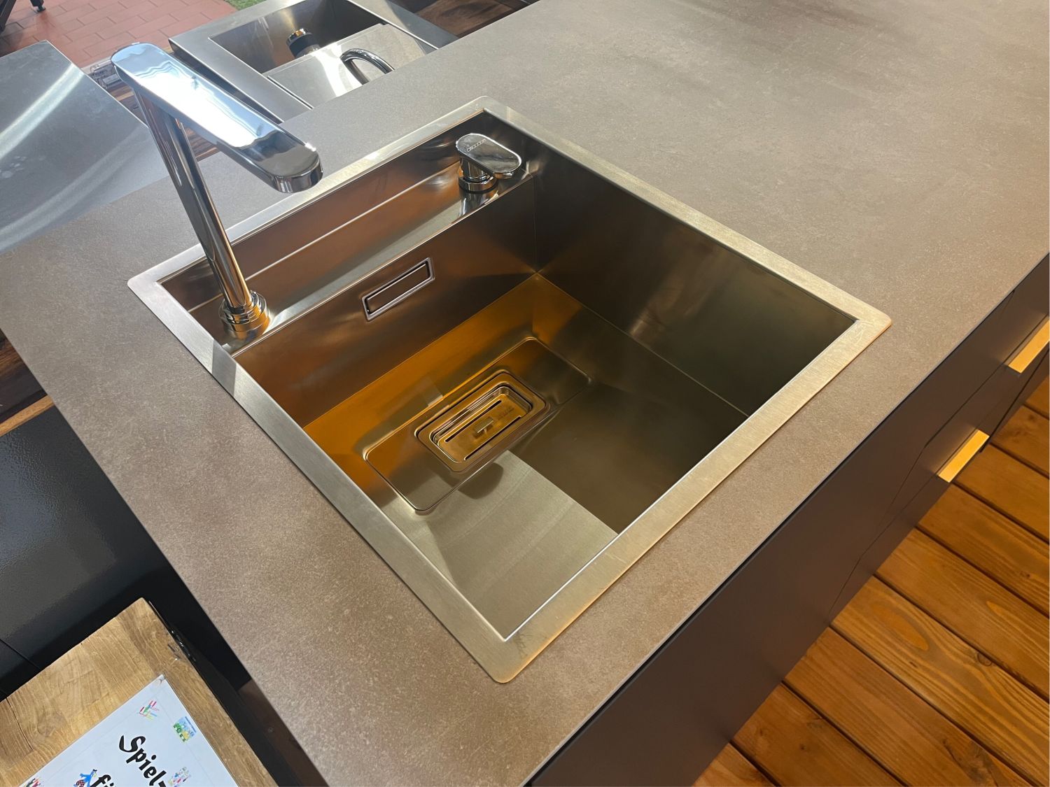 Der Napoleon BI-10 Seitenbrenner fügt sich nahtlos in das Design ein und bietet volle Kontrolle bei der Zubereitung von Soßen oder Beilagen. Direkt daneben: ein integriertes Spülbecken mit hochwertiger Armatur und Abdeckung, die bündig abschließt – für einen aufgeräumten Look. Die versenkbare Armatur aus Edelstahl lässt sich komfortabel nach unten klappen, damit die Abdeckplatte bündig abschließen kann.