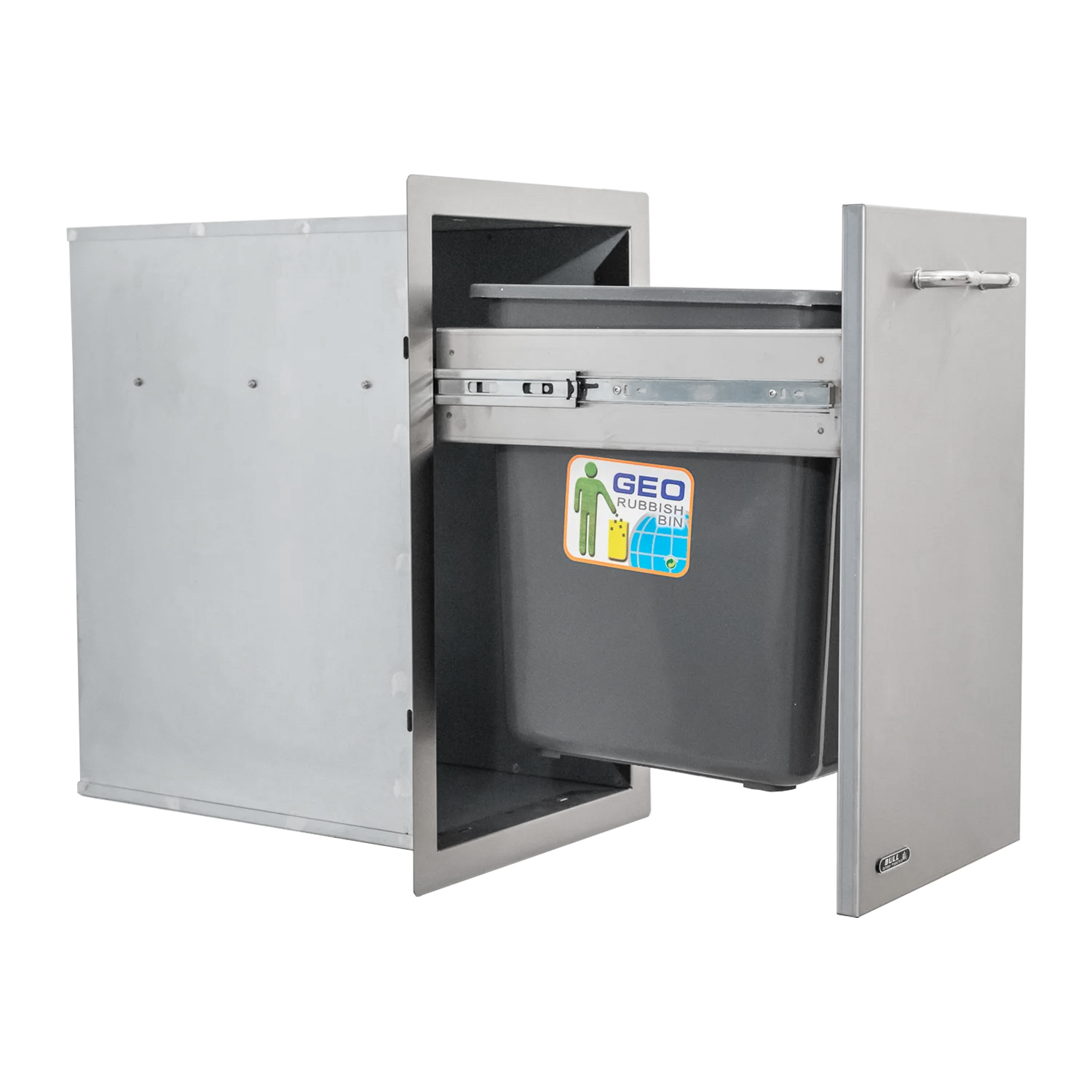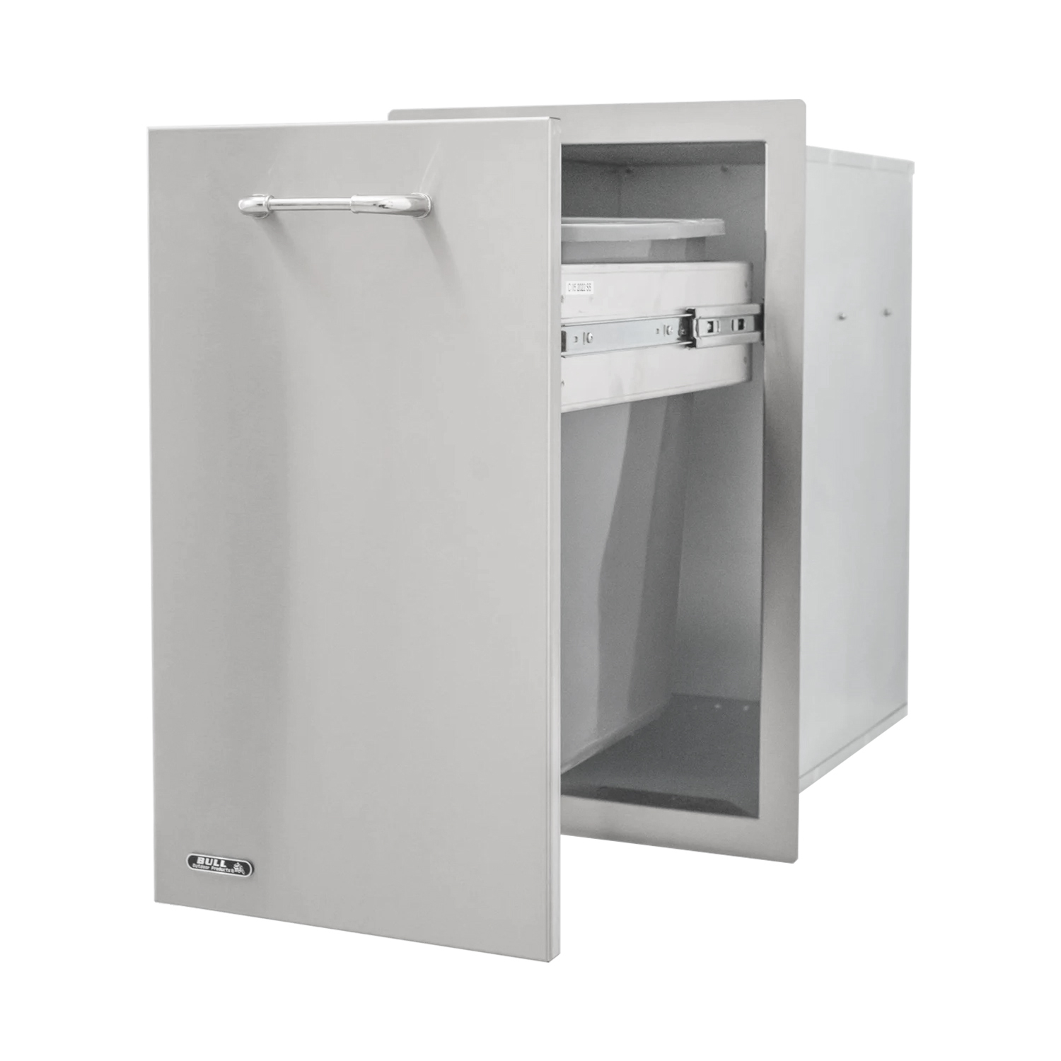 Die große BULL Einbau Schublade beherbergt einen hängenden Mülleimer, der sich zur Entsorgung des Mülls einfach entnehmen lässt. So bleibt Ihre Außenküche immer frei von Müll.