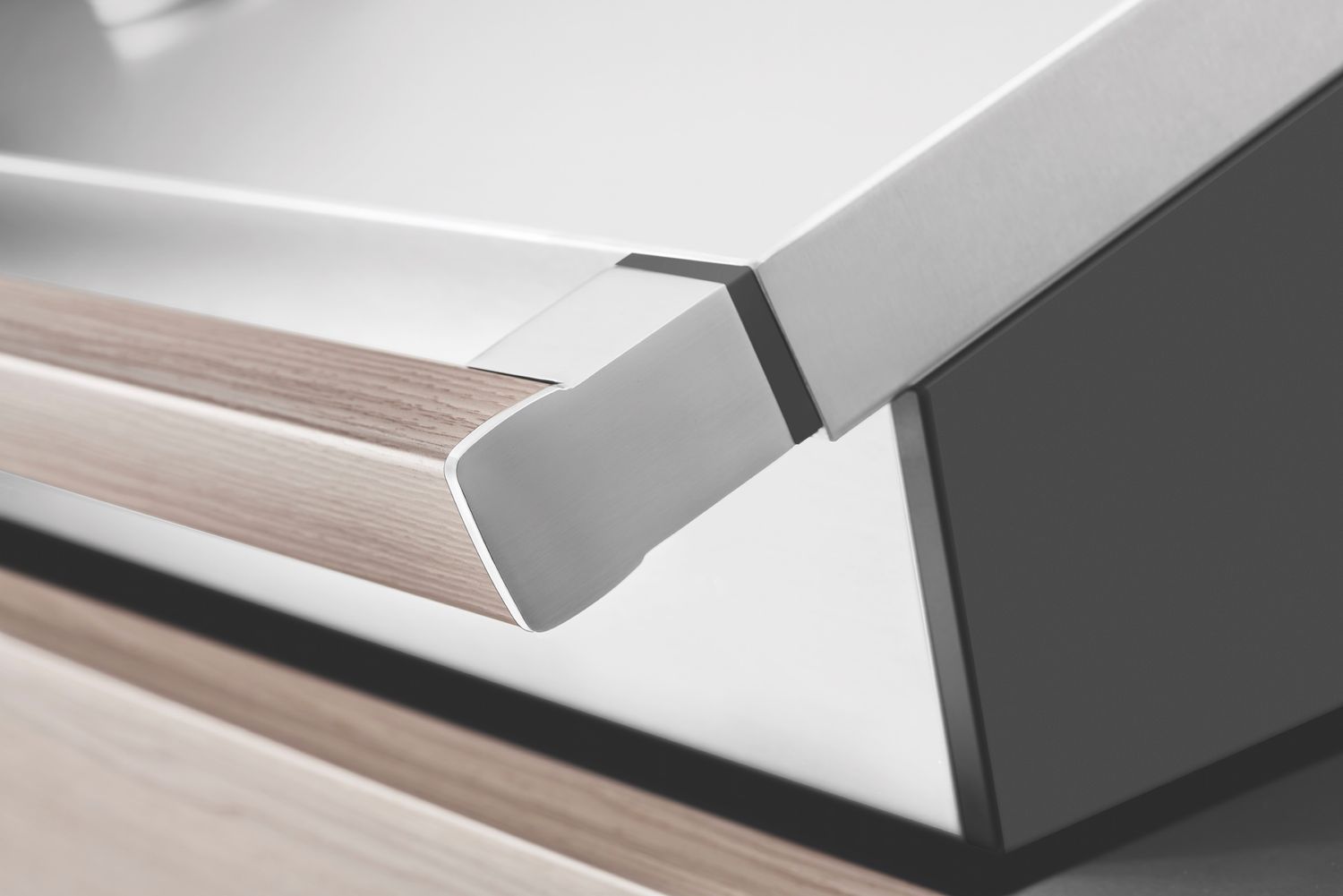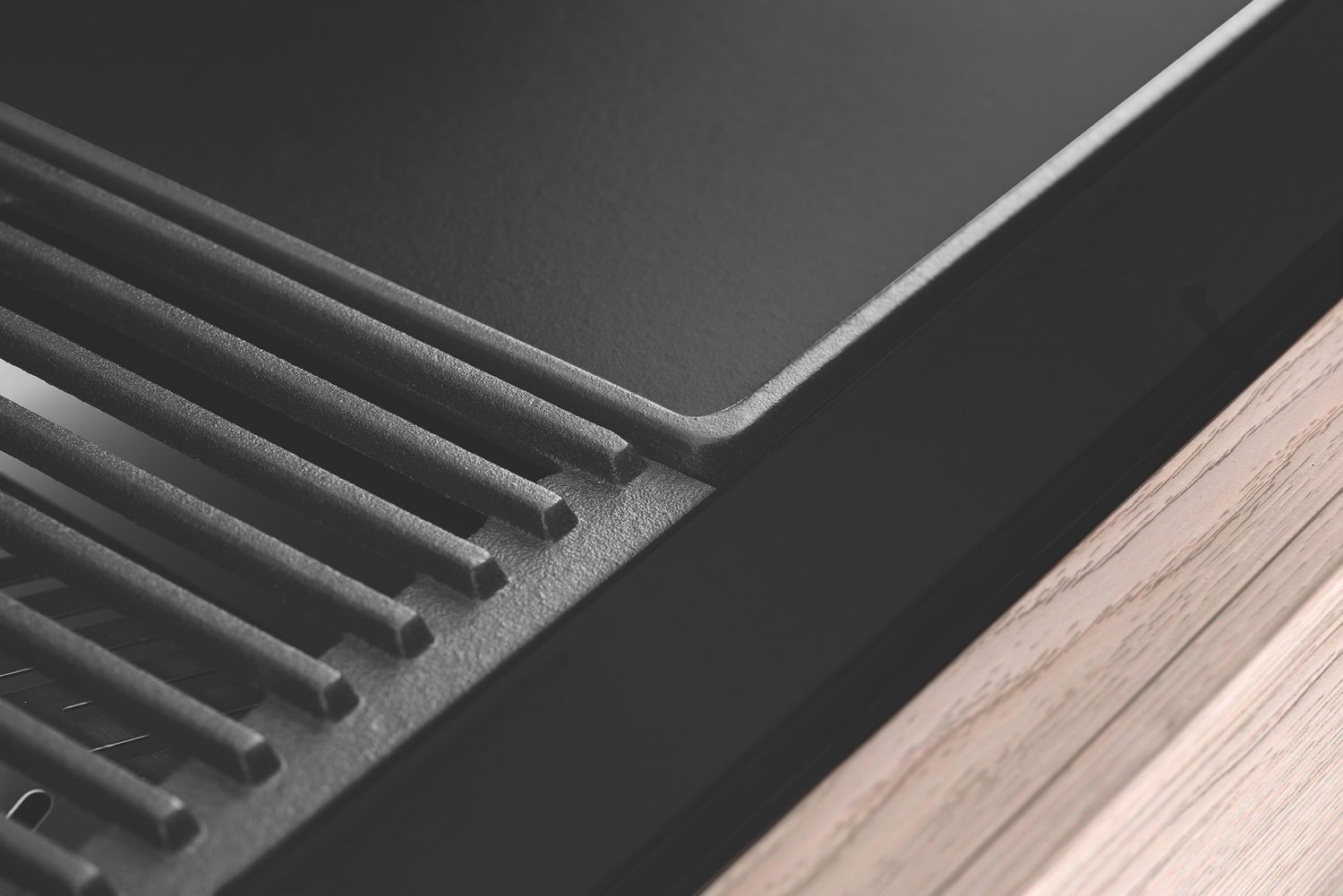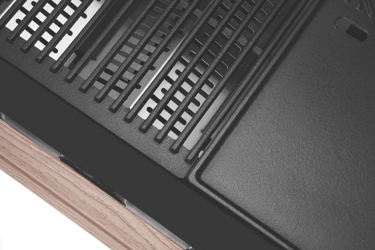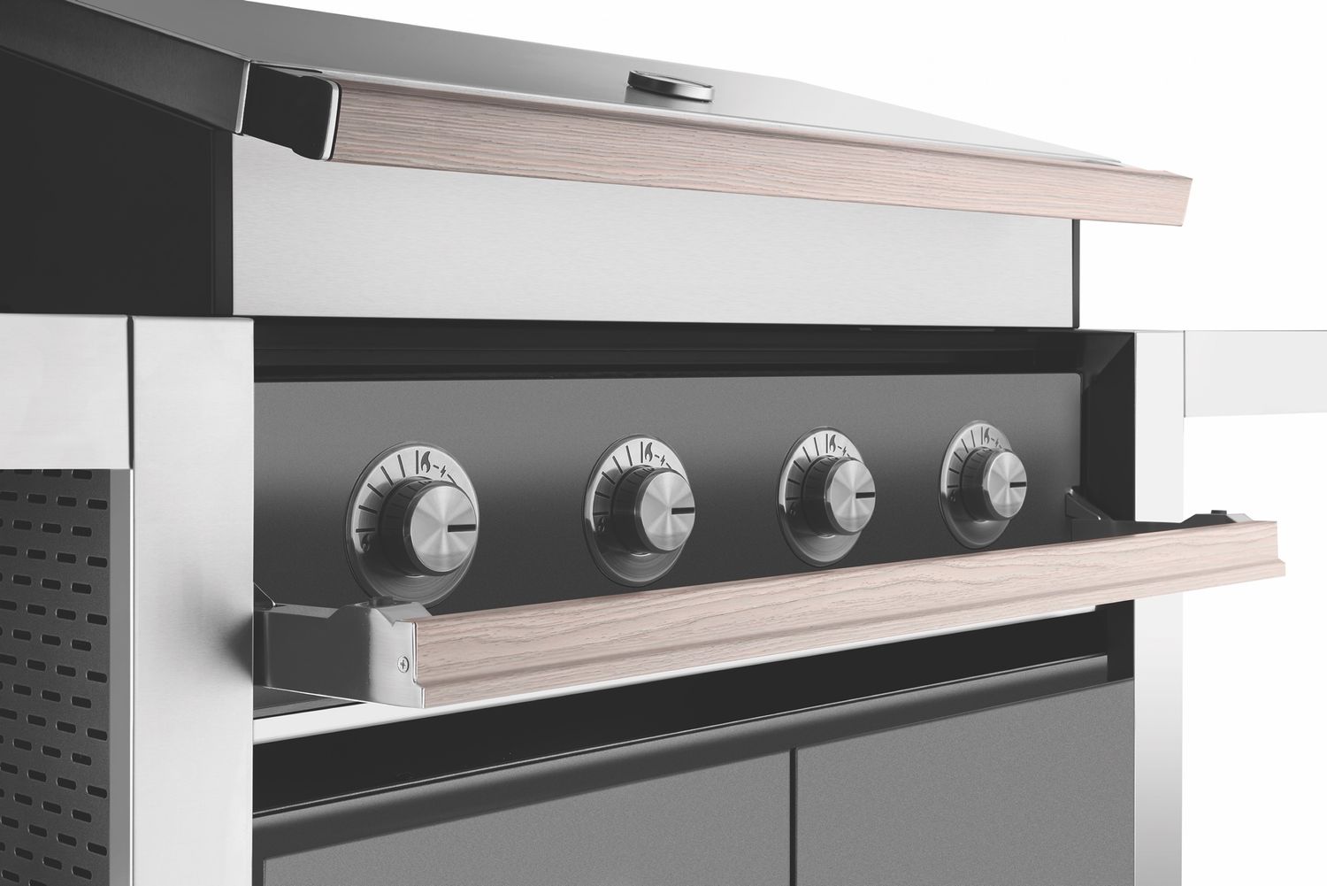 Einzigartig und besonders stilvoll lassen sich die Drehregler mit einer Bedienfeldblende verstecken. Die klappbare Blende mit 2 Scharnieren besitzt eine helle Holzoptik und verdeckt die komplette vordere Front des Einbaugrills. Wird der Grill gerade nicht gebraucht, kann die Blende einfach hoch geklappt werden.