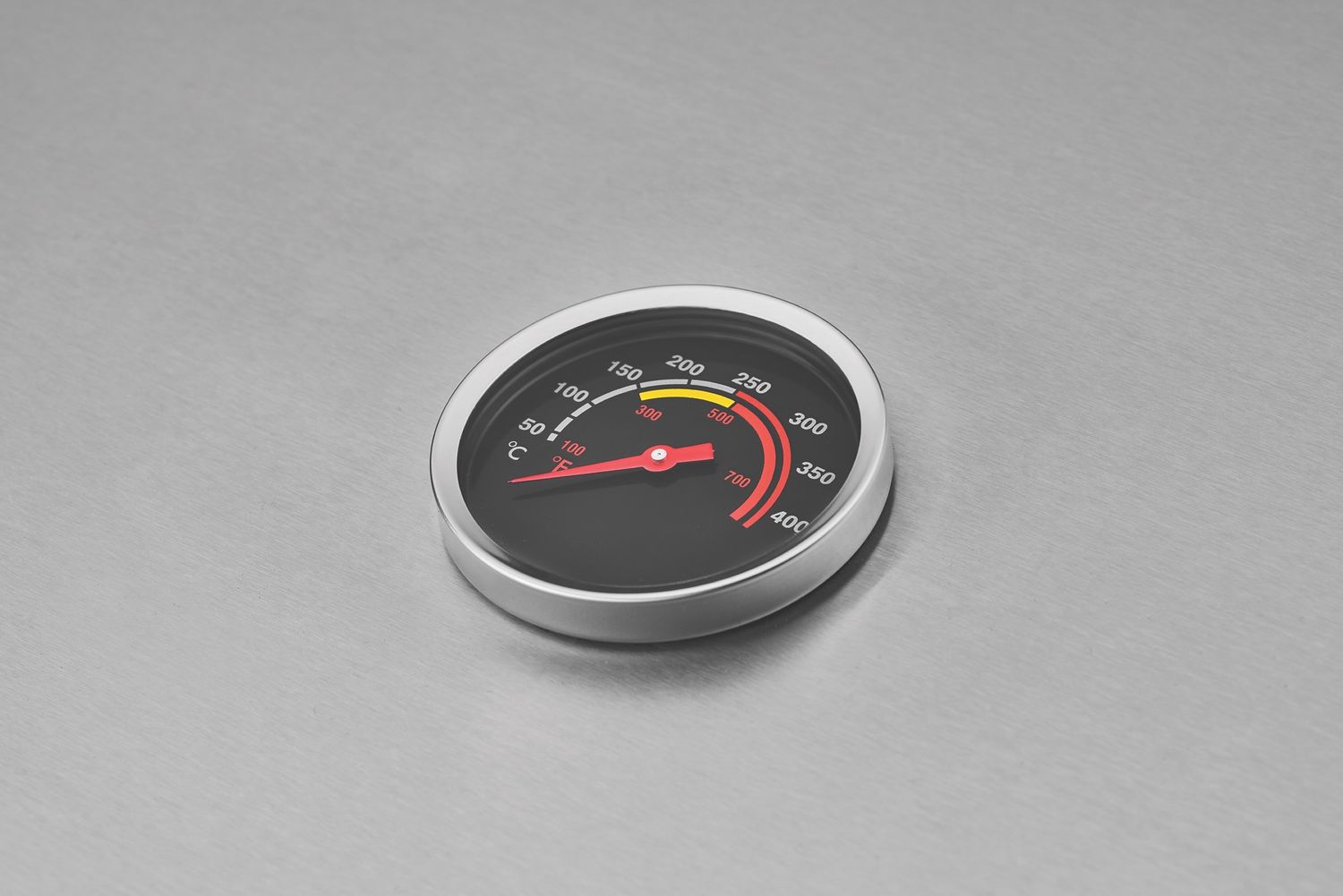 Die Deckel bietet zusätzlich ein praktisches Deckelthermometer, mit welchem die Garraumtemperatur ganz einfach kontrolliert werden kann sowie ein Design-Deckelgriff in Holzoptik.