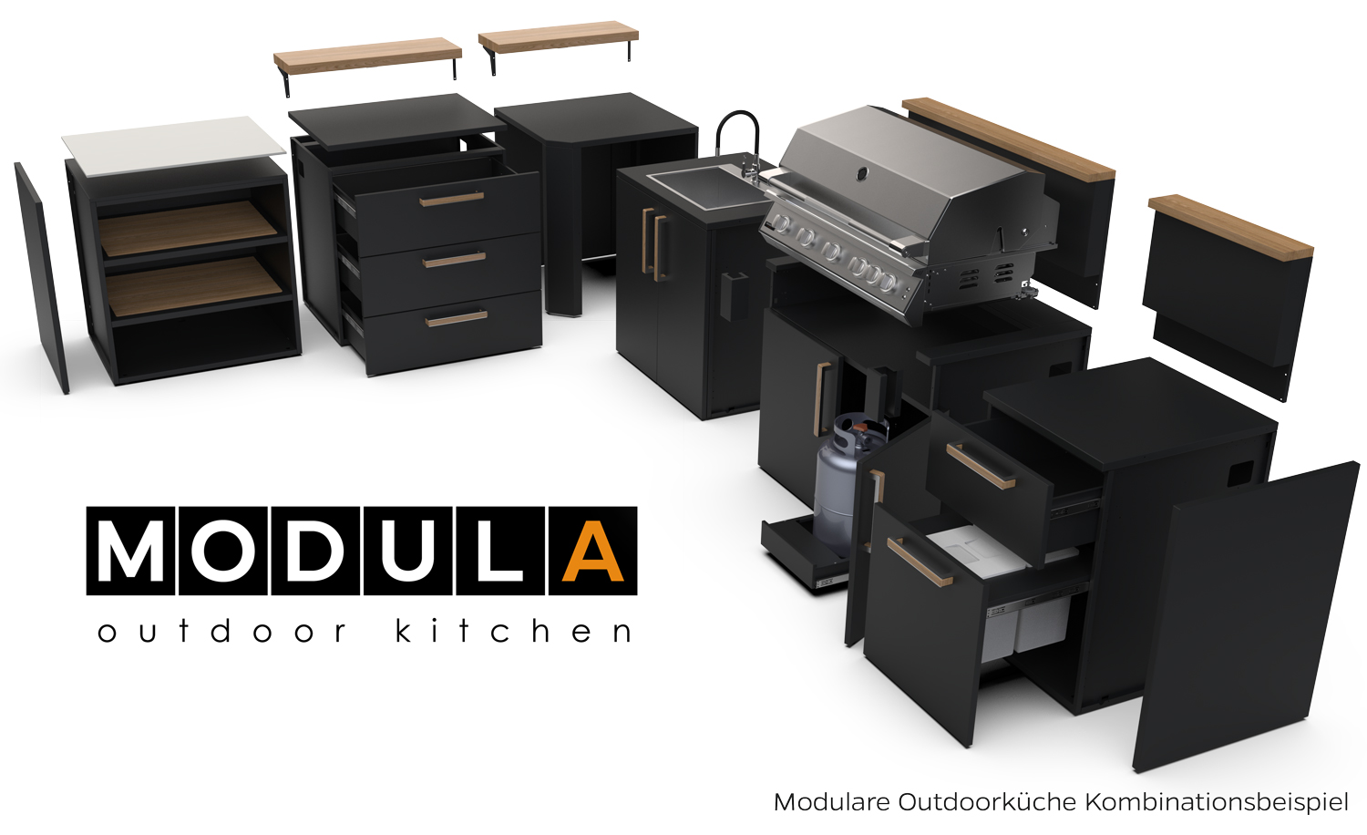 Das Herzstück des Sortiments sind modulare Outdoor Küchen. Diese Systeme bestehen aus verschiedenen Modulen für Grills, Stauraum, Spülen, Kühlschränke oder Arbeitsflächen und lassen sich flexibel kombinieren.