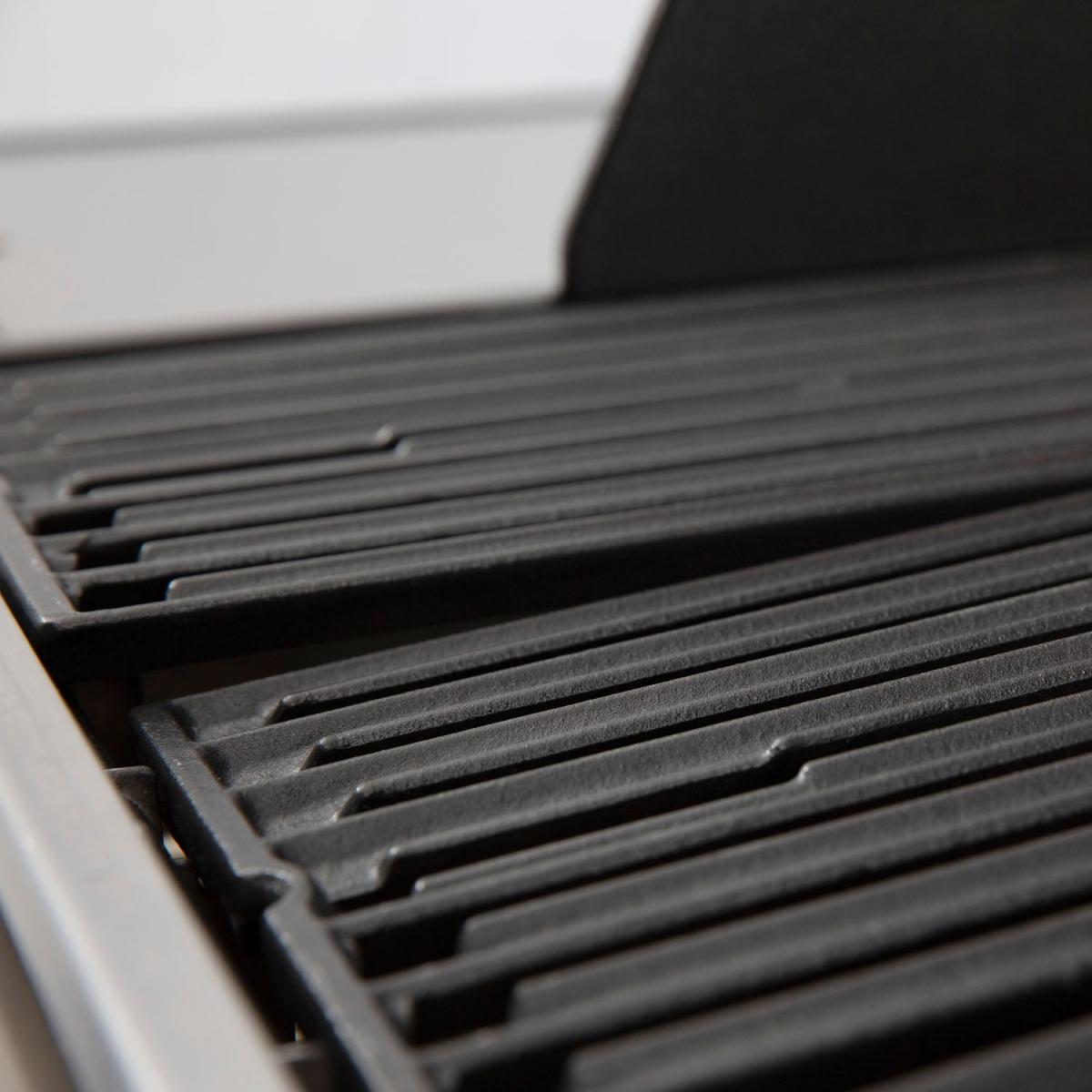 Allgemein ist Gusseisen das bevorzugte Material für Grillroste, doch Broil King geht hier eigene Wege. Die massiven Gusseisenroste der Broil King Gasgrills sind beidseitig nutzbar. Standardmäßig zeigt die spitz zulaufende Seite nach oben – deutlich spitzer als bei anderen Herstellern – und erzeugt besonders scharfe Grillmarkierungen (Brandings). Von unten sind die Roste in dieser Position hohl geformt, sodass sich Hitze darin staut und die Temperatur auch von unten konstant hoch bleibt. Zudem sind die Abstände zwischen den Streben sehr gering, wodurch kaum ungenutzte Hitze entweicht. Alternativ können sie die Roste umgedreht einsetzen, um Fett und Bratensaft vom Grillgut weg abzuleiten – ideal für lange Garzeiten wie z.B. bei einem Braten sowie alle marinierten oder fettigeren Speisen.