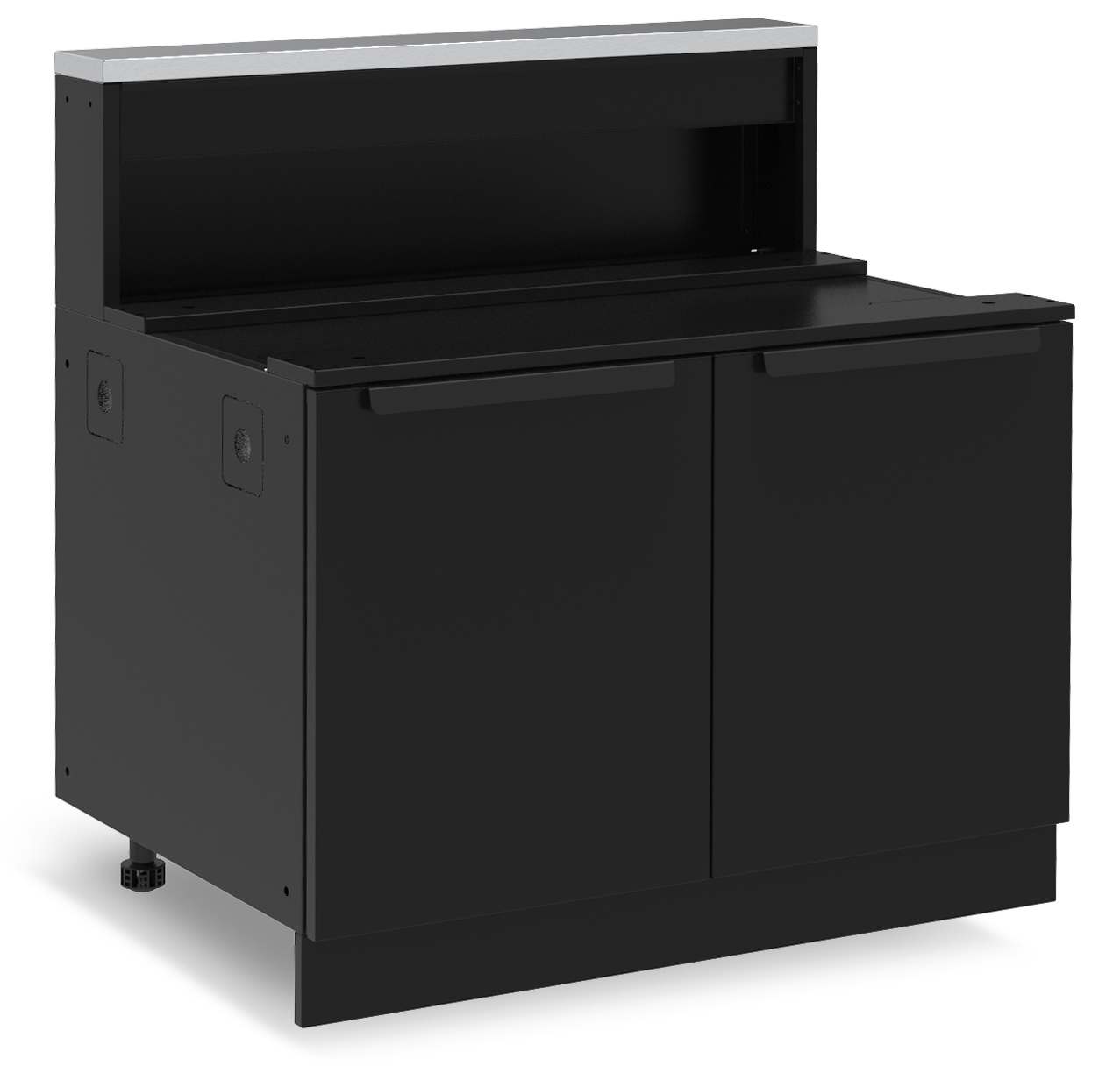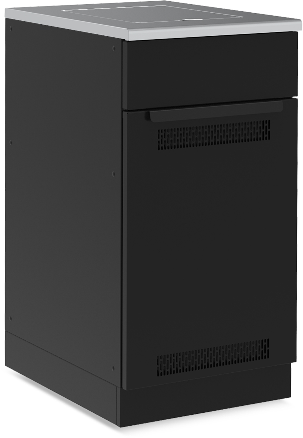 Die Schränke bestehen aus verzinktem und pulverbeschichtetem Stahl und sind speziell für den Einsatz im Außenbereich konzipiert. Edelstahl Arbeitsflächen sorgen für eine langlebige, pflegeleichte Oberfläche und unterstreichen den hochwertigen Charakter der Outdoor Küche.