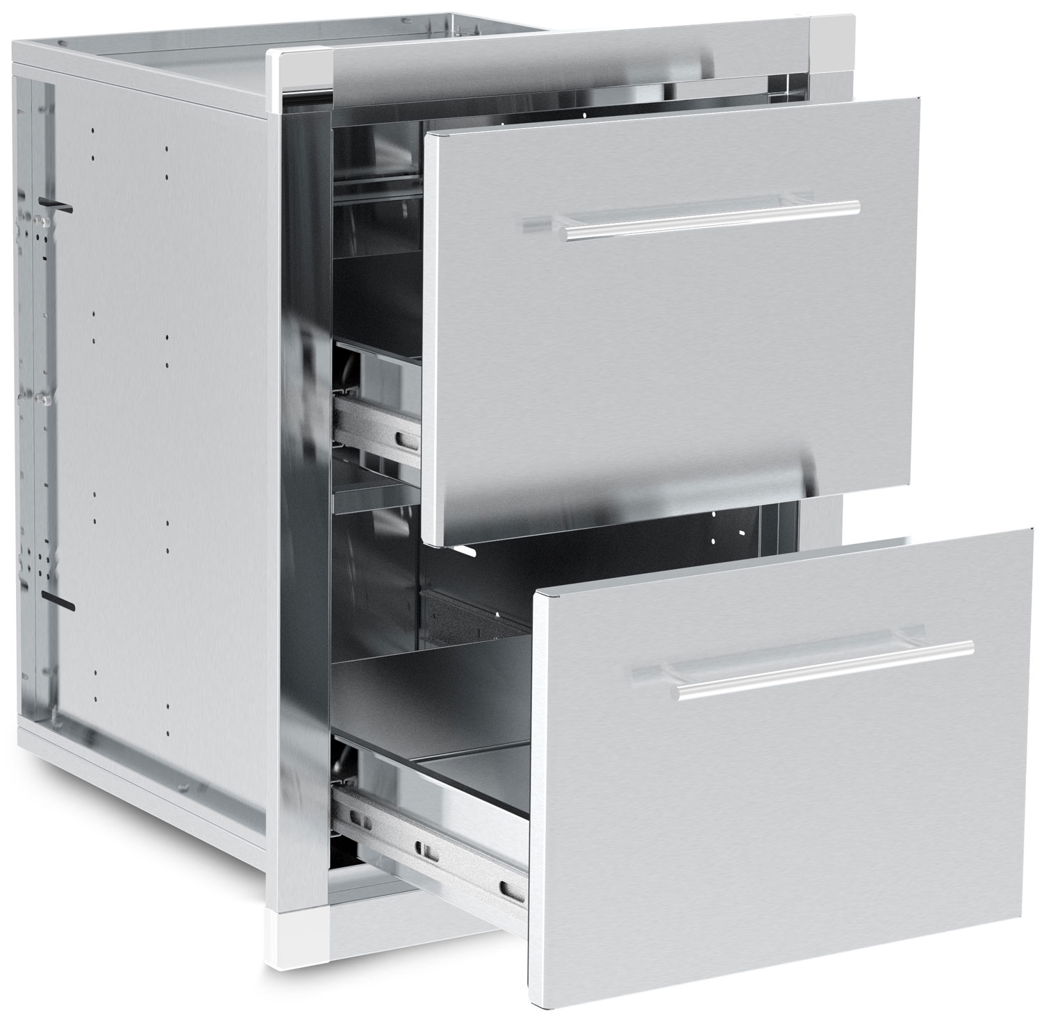 Der Einbauschrank mit 2 Schubladen eignet sich perfekt für den Einbau in individuelle Konstruktionen. So schaffen Sie ganz unkompliziert einen leicht zugänglichen, komplett abgeschlossenen Stauraum zur sauberen und hygienische Aufbewahrung von Koch- und Grillutensilien in ihrer Outdoorküche.