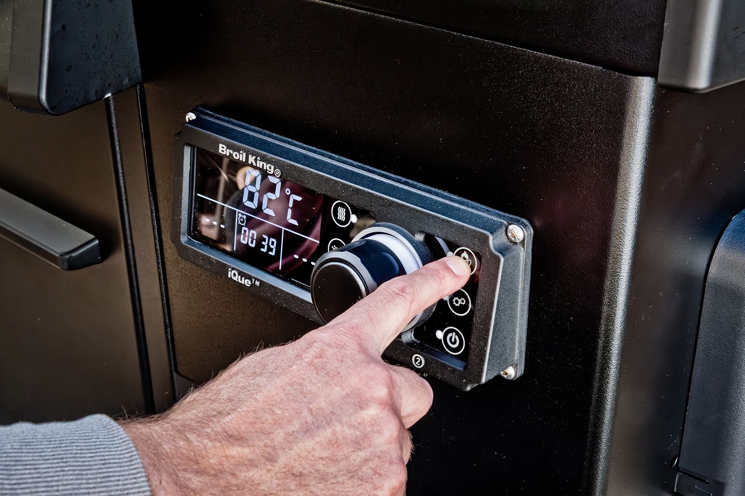 Der integrierte iQue Smart Controller sorgt für eine präzise Temperatursteuerung beim Pelletgrillen. Über Wi-Fi und Bluetooth lässt sich der Garprozess komfortabel per Smartphone überwachen, sodass Temperatur und Verlauf jederzeit im Blick bleiben.