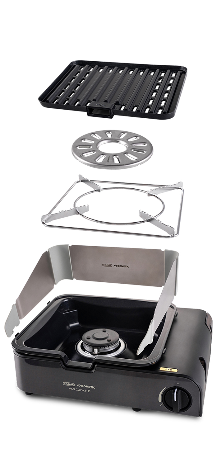 Gerade beim Camping ist Platz immer ein kostbares Gut. Der CADAC Van Cook FFD ist so kompakt, dass er auch in die kleinste Camping-Küche passt. Trotz der geringen Abmessungen müssen sie aber auf nichts verzichten: Durch das umfangreiche Zubehör wechseln sie in kürzester Zeit zwischen dem klassischen Topfständer, dem speziellen Kaffeekannenständer für den morgendlichen Espresso oder der hochwertigen BBQ-Grillplatte zum Grillen.