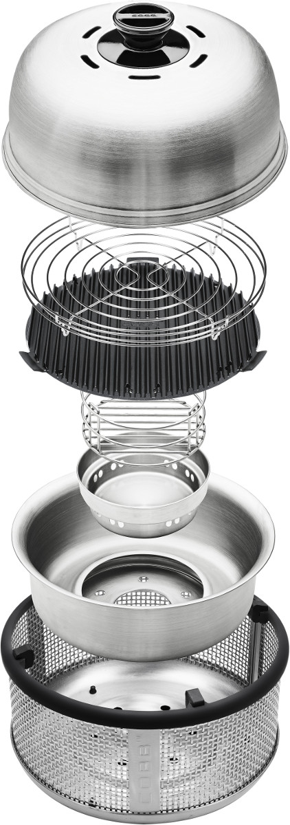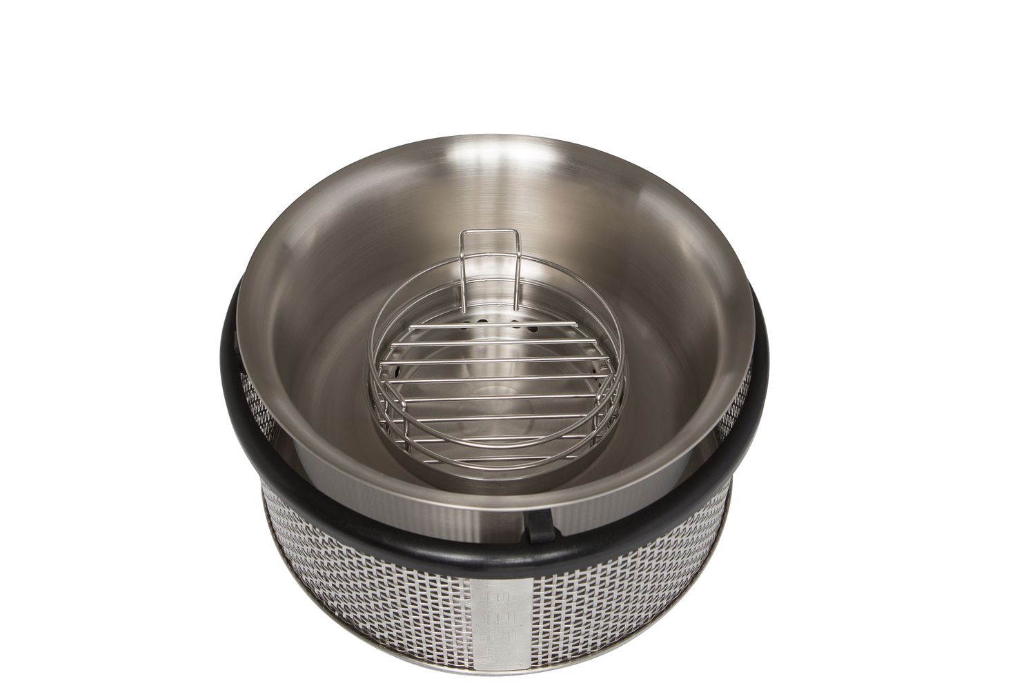 Im Stahlgitterkorb befindet sich die Fettauffangwanne mit einer Brennkammer aus Edelstahl. Da diese direkt abnehmbar ist, gestaltet sich die Reinigung besonders einfach.