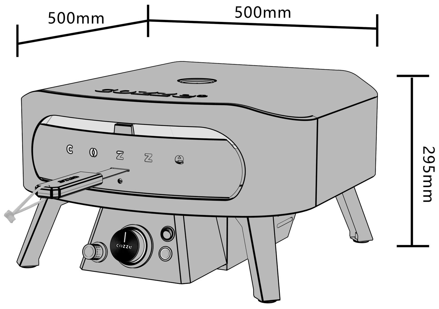 Dank seiner kompakten Abmessungen von 50 x 50 x 29,5 cm benötigt der 13 Zoll Gas Pizzaofen nur wenig Standfläche, bietet aber im Innenraum eine großzügige Backfläche für Pizzen bis zu 34 cm Durchmesser. Die komfortable Frontöffnung von 36 x 10 cm ermöglicht ein einfaches Einschieben und Herausnehmen der Pizzen.