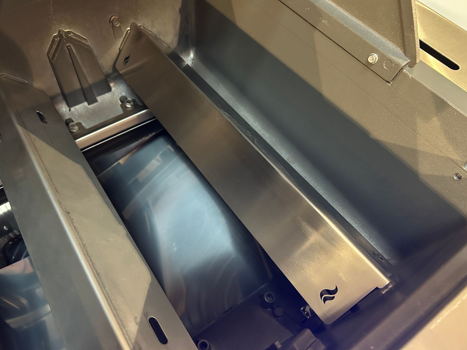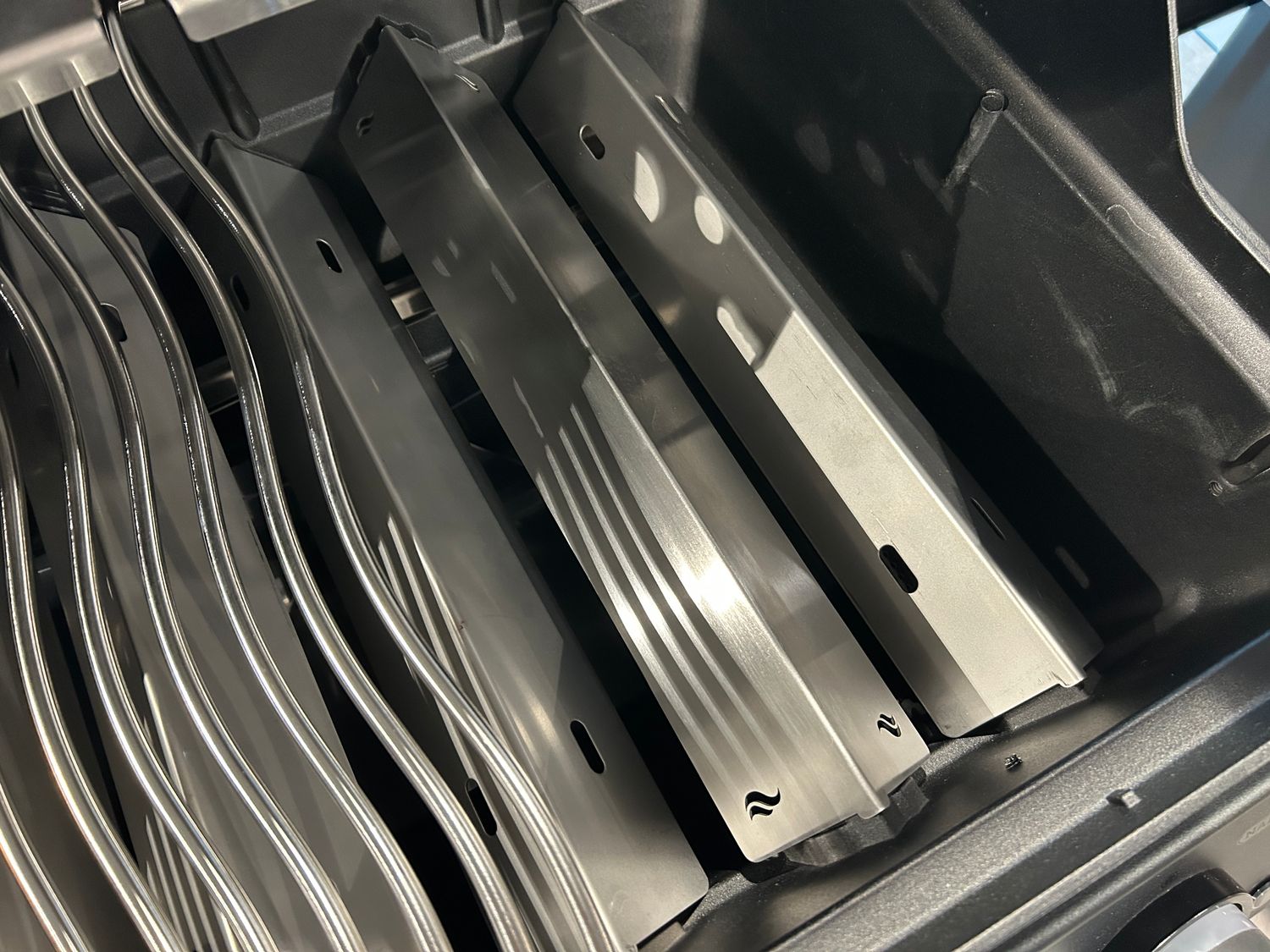 Damit während des Grillens kein Fettbrand entsteht, sitzt über jedem Gasbrenner ein Flammenschutzblech. Diese sogenannten Flammenverteiler bzw. Aromaschienen verhindern, dass heruntertropfendes Fett in die Flammen gelangen kann. Zusätzlich verteilen die Bleche die Hitze gleichmäßig auf der gesamten Grillfläche.