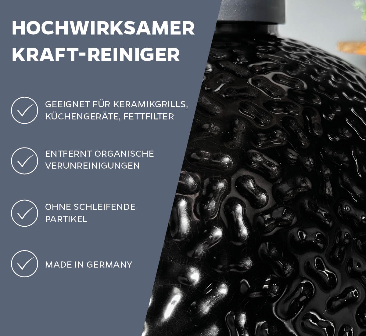 Der hochwirksame Kraft-Reiniger befreit schnell und einfach von Öl- und Fettablagerungen im gesamten Outdoorküchen-Bereich und ist aufgrund seiner intensiven und dennoch schonenden Fettlöse-Kraft insbesondere für Keramikgrills, Emaille und emaillierte Roste optimal geeignet.