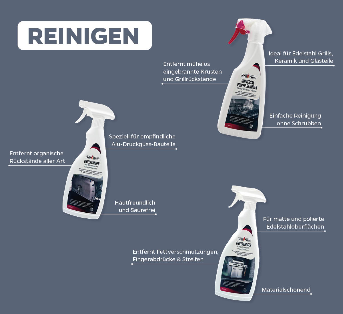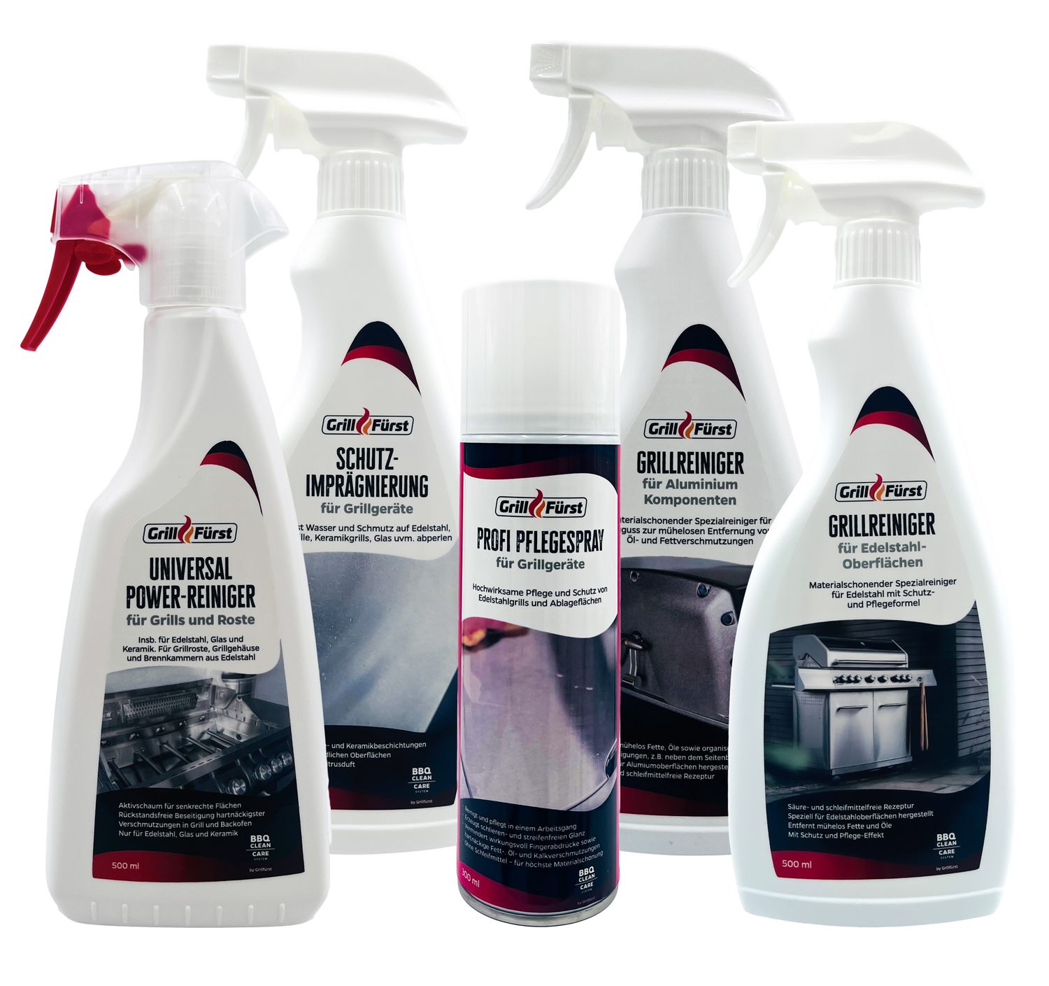 Das perfekte aufeinander abgestimmte Reinigungsset bietet 5 hochwirksame Grillreiniger. Die effektiven Rezepturen reinigen spielend einfach verkrustete Edelstahlroste und verschmutzte Edelstahlflächen, ohne das Material anzugreifen oder Schlieren zu hinterlassen. Befreien sie die Aluguss-Brennerwanne sowie die Aluguss-Seitenteile des Garraums von hartnäckigen Verschmutzungen und lassen die Seitenablagen ihres Grills wieder strahlen. Für ein perfektes Finish werden alle Edelstahlteile mit einer speziellen hitzebeständigen Schutzimprägnierung versiegelt, welche effektiv vor Neuverschmutzungen schützt. Zum Auffrischen zwischendurch und, um Fingerabdrücke zu entfernen, verwenden sie zusätzlich das Profi-Pflegespray.