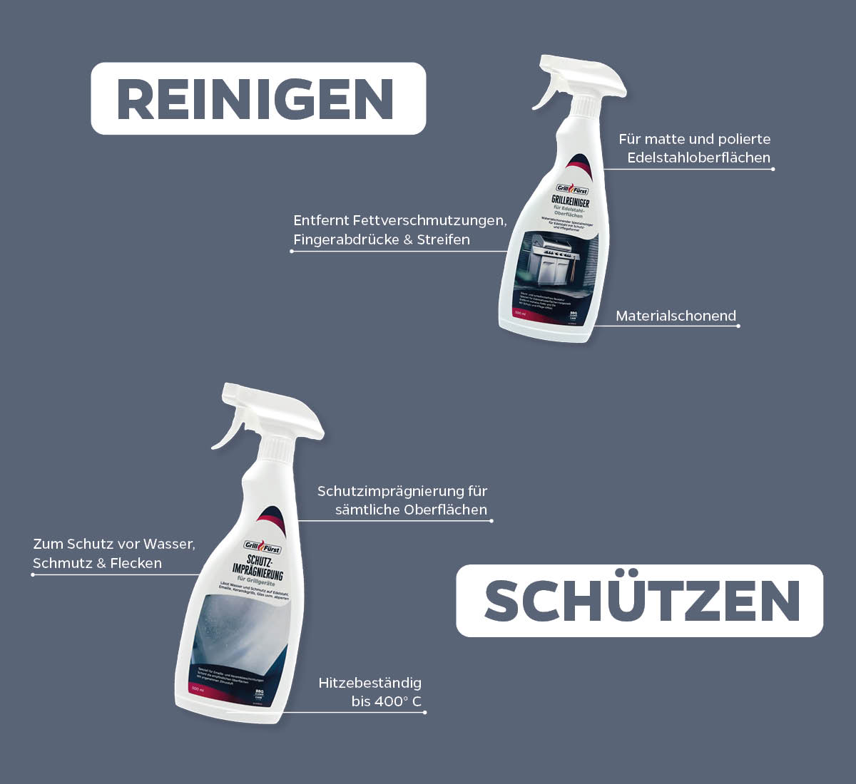 Das perfekt aufeinander abgestimmte Reinigungsset bietet 4 hochwirksame Grillreiniger. Die effektiven Rezepturen reinigen spielend einfach verkrustete Edelstahlroste und verschmutzte Edelstahlflächen, ohne das Material anzugreifen oder Schlieren zu hinterlassen. Befreien sie die Sichtscheibe von hartnäckigen Verschmutzungen und lassen die Brennerwanne und die Seitenablagen ihres Grills wieder strahlen. Für ein perfektes Finish werden alle Edelstahlteile mit einer speziellen hitzebeständigen Schutzimprägnierung versiegelt, welche effektiv vor Neuverschmutzungen schützt.