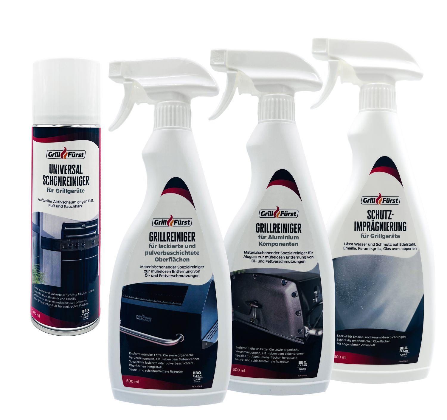 Das perfekt aufeinander abgestimmte Reinigungsset bietet 4 hochwirksame Grillreiniger, welche die matt schwarze Oberfläche schonend reinigt, Alu-Druckguss-Komponenten wieder wie neu aussehen lässt und effektiv vor Neuverschmutzung schützt.