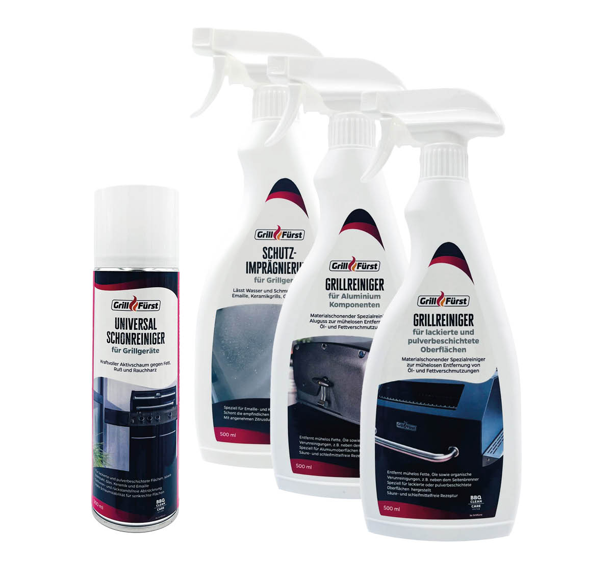 Das perfekt aufeinander abgestimmte Reinigungsset bietet 4 hochwirksame Grillreiniger, welche insbesondere für lackierte und pulverbeschichtete Grills und Oberflächen geeignet sind. Lösen sie hartnäckige Verkrustungen mühelos mit dem effektiven Universal Schonreiniger, welcher mit einem besonders kraftvollen Aktivschaum zuverlässig sämtliche Reste beseitigt und entfernen mit dem Sprühreiniger Fett-, Öl- und Marinadenreste mit nur einem Wisch. Mit dem Spezialreiniger für Aluguss wird auch die Brennerwanne wieder strahlend sauber. Auch die Arbeitplatte wird mit dem Grillreiniger für lackierte und pulverbeschichtete Oberflächen spielend einfach glänzend rein. Für ein perfektes Finish werden alle Oberflächen mit einer speziellen hitzebeständigen Schutzimprägnierung versiegelt, welche effektiv vor Neuverschmutzungen schützt.