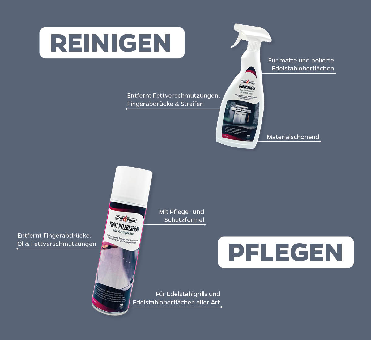 Das perfekt aufeinander abgestimmte Reinigungsset bietet 4 hochwirksame Grillreiniger. Die effektiven Rezepturen reinigen spielend einfach verkrustete Edelstahl-Oberflächen ohne das Material anzugreifen oder Schlieren zu hinterlassen. Befreien sie die Sichtscheibe von hartnäckigen Verschmutzungen und lassen die Brennerwanne und die Seitenablagen ihres Grills wieder strahlen. Zum Auffrischen zwischendurch und, um Fingerabdrücke zu entfernen, verwenden sie zusätzlich das Profi-Pflegespray um sämtliche Edelstahlflächen "wie neu" aussehen zu lassen.