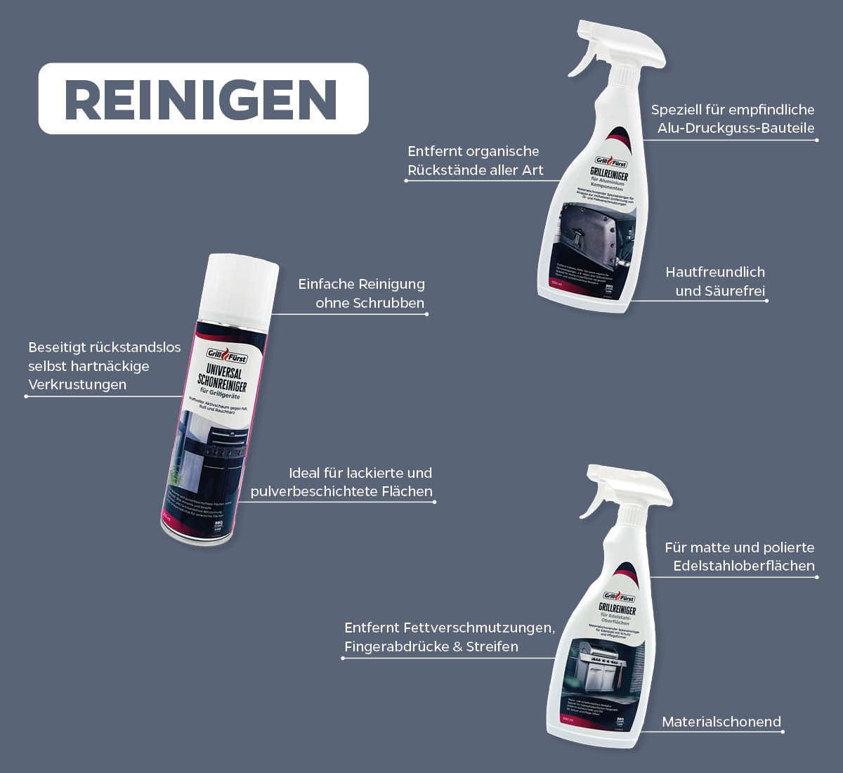 Das perfekt aufeinander abgestimmte Reinigungsset bietet 5 hochwirksame Grillreiniger, welche insbesondere für lackierte und pulverbeschichtete Grills geeignet sind. Lösen sie hartnäckige Verkrustungen mühelos mit dem effektiven Universal Schonreiniger, welcher mit einem besonders kraftvollen Aktivschaum zuverlässig sämtliche eingebrannten Reste beseitigt. Mit dem Spezialreiniger für Aluguss werden auch die Seitenteile des Deckels wieder strahlend sauber. Die Seitenablagen und die Bedienblende werden mit dem Grillreiniger für Edelstahl spielend einfach glänzend rein. Für ein perfektes Finish werden alle Oberflächen mit einer speziellen hitzebeständigen Schutzimprägnierung versiegelt, welche effektiv vor Neuverschmutzungen schützt.