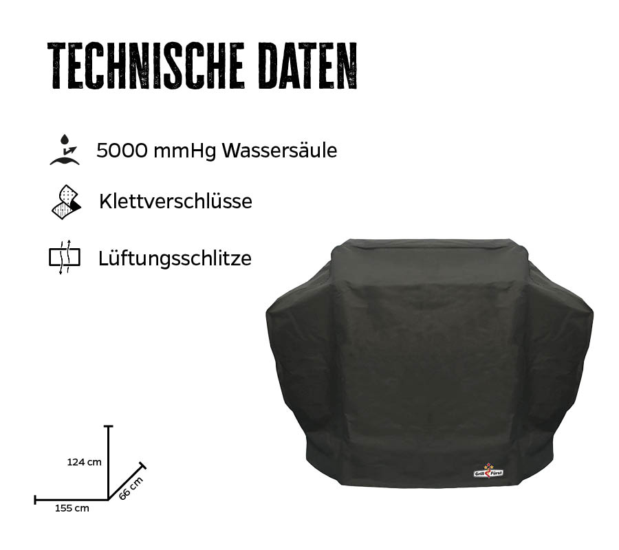 - Abmessungen: 155 x 66 x 124 cm - auch für viele weitere Grillmodelle nutzbar siehe Tabelle weiter unten