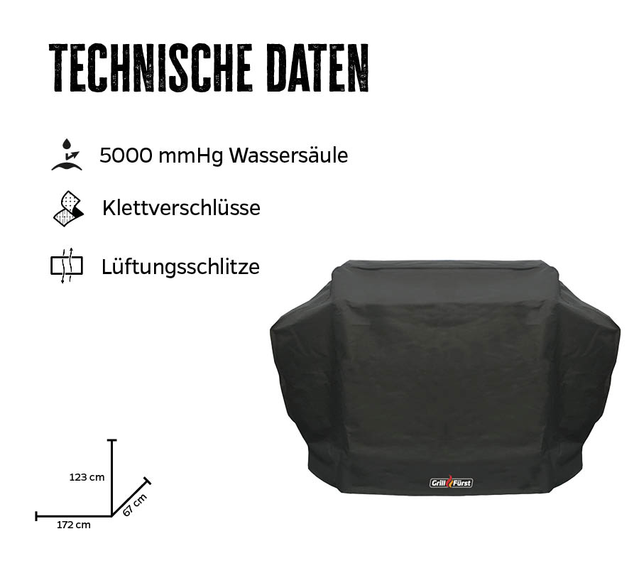 - Abmessungen: 172 x 67 x 123 cm - auch für viele weitere Grillmodelle nutzbar, siehe Tabelle weiter unten