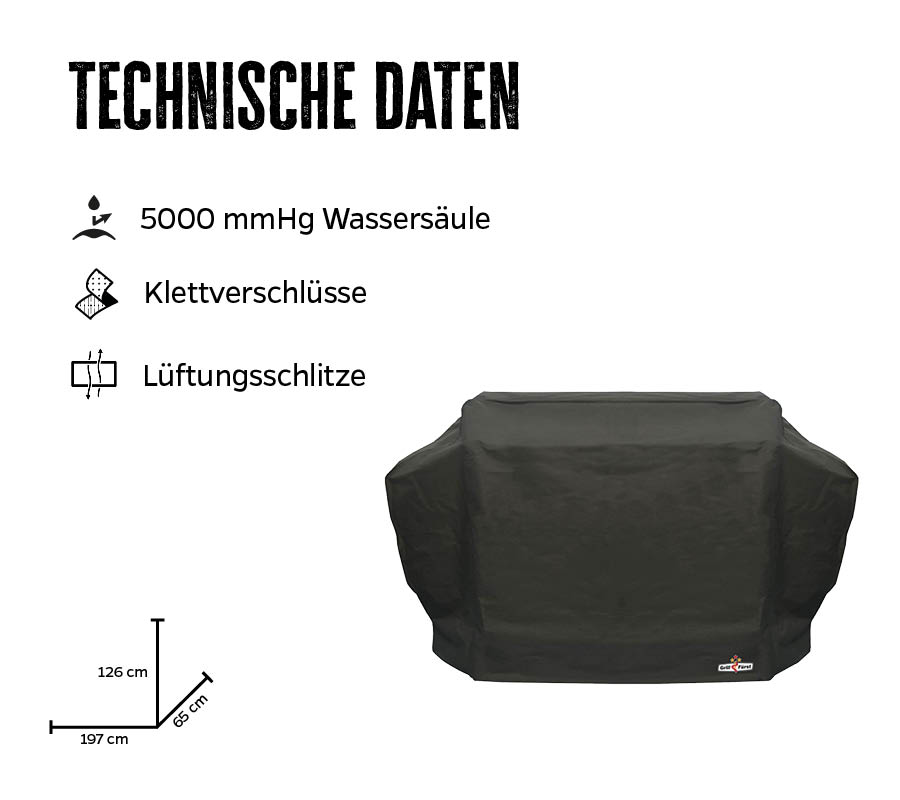 - Abmessungen: 197 x 65 x 126 cm - auch für viele weitere Grillmodelle nutzbar, siehe Tabelle weiter unten