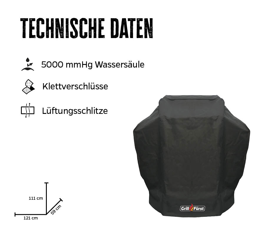 - Abmessungen: 121 x 59 x 111 cm - auch für viele weitere Grillmodelle nutzbar, siehe Tabelle weiter unten