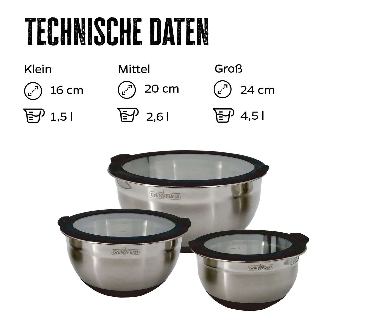 Grillfürst BBQ 3er Edelstahlschüssel Set mit Glasdeckel bestehend aus: