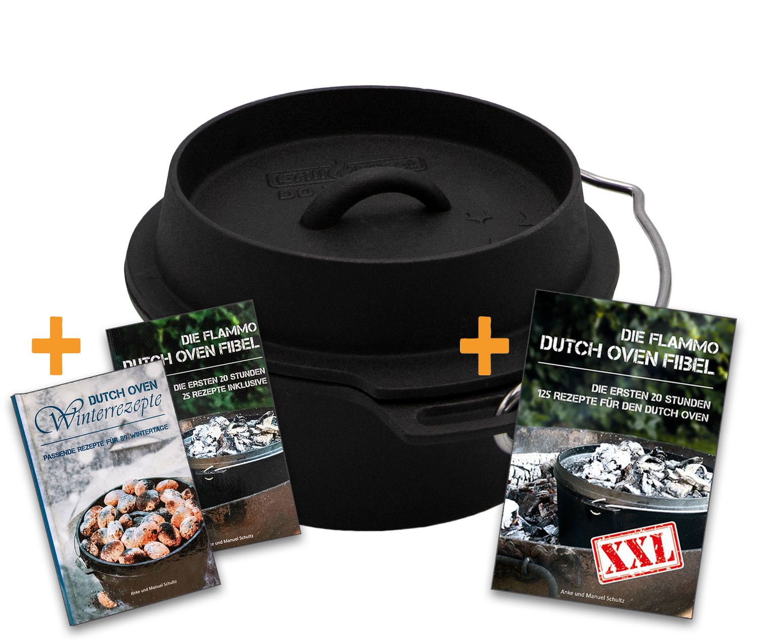 Der massive Gusseisentopf besitzt einen flachen Boden, damit er platzsparend und komfortabel direkt auf dem Grillrost oder dem Herd platziert werden kann. Der Dutch Oven ist dennoch universell einsetzbar und lässt sich selbstverständlich bei Bedarf auch traditionell mit Briketts oder in der Feuerstelle anheizen.