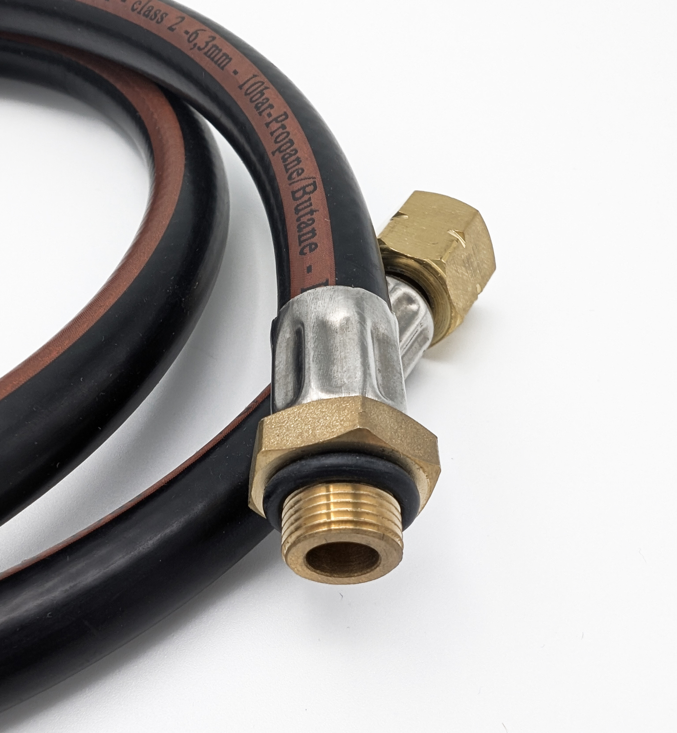 Dazu ist der Gasschlauch auf einer Seiten mit einem 1/4 Zoll Linksgewinde Anschluss mit Überwurfmutter ausgestattet und auf der anderen Seite mit einem 7/16 Zoll Linksgewinde, dem standardisierten Anschluss für Schraubkartuschen.