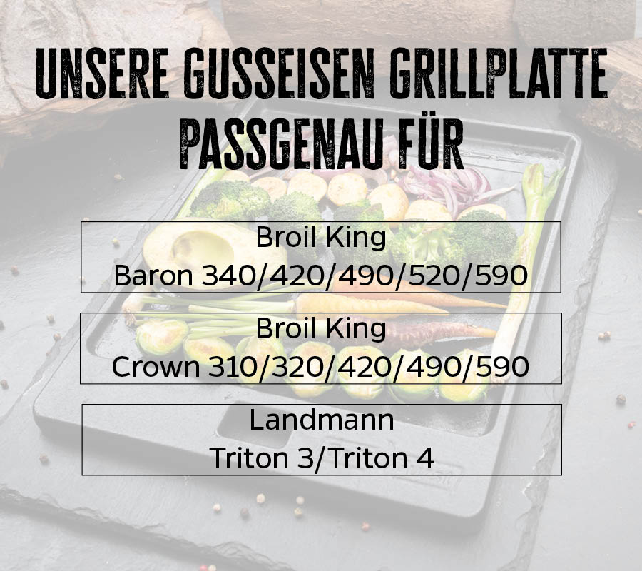 Die Grillplatte ist für eine große Auswahl an Grillmodellen unterschiedlicher Hersteller verfügbar und auf die jeweilige Größe des Garraums bzw. der Grillroste abgestimmt. Wählen Sie einfach anhand der Bezeichnung Ihres Gasgrills die passende Grillfürst Grillplatte aus.