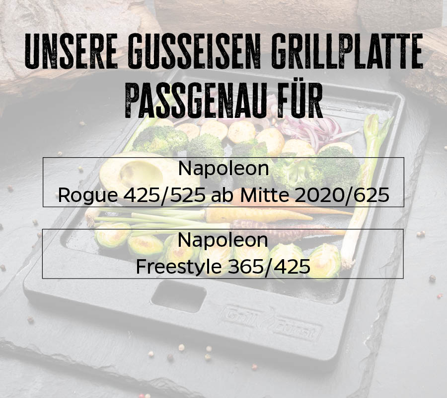 Die Grillplatte wird beim Rogue 525 gegen einen der breiten Grillroste in der Grillfläche ausgetauscht. Bei der Breite dieser Grillroste gab es aber ca. Mitte 2020 eine Änderung von 25,3 cm auf 29,5 cm. Bitte kontrollieren Sie daher beim Nachkauf der Platte unbedingt die Grillrostbreite der beiden großen Grillroste in Ihrem Grill.