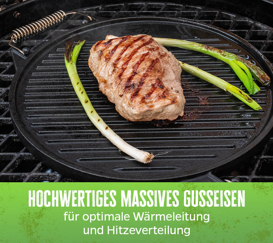 Das macht die Grillwendeplatte aus Gusseisen extrem vielfältig in den Einsatzmöglichkeiten, vom Plancha Grillen bis hin zum Zubereiten leckerer Steaks! Insbesondere bei Kugelgrills eignet sich die runde Gussplatte ideal, da die Grillfläche optimal ausgenutzt werden kann.