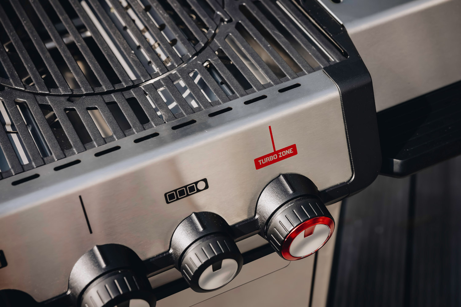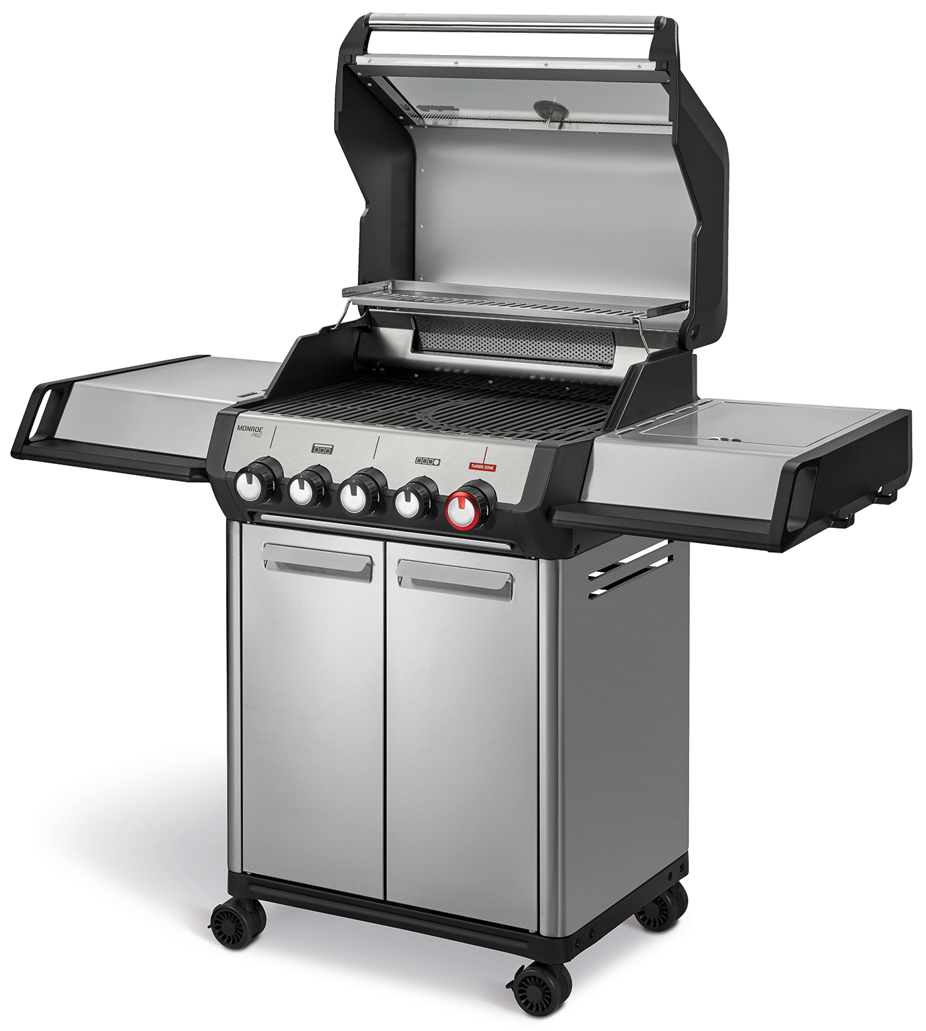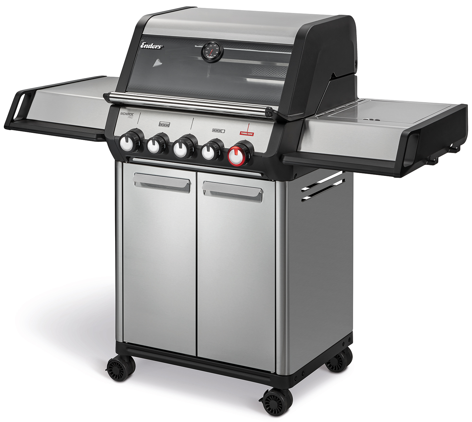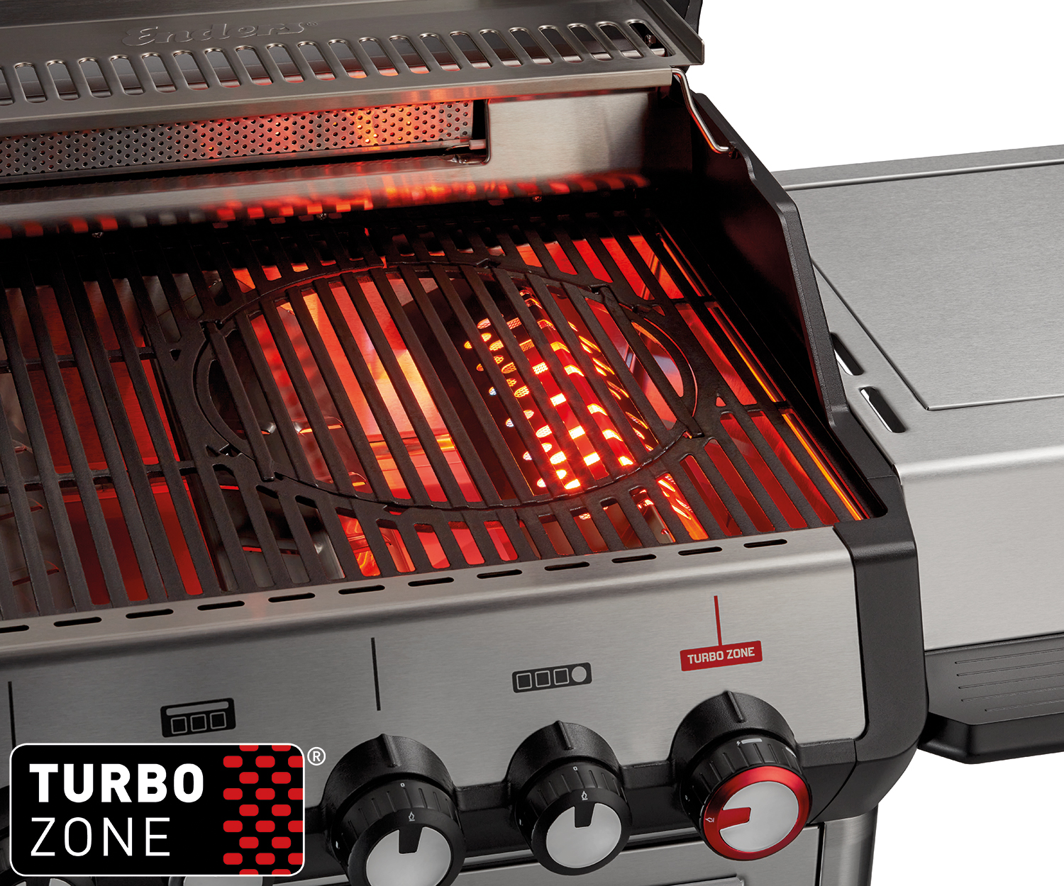 Ein besonderes Highlight der Enders Monroe Pro Gasgrills ist die in die Grillfläche integrierte TURBO ZONE™, die sich über den roten Drehregler zuschalten lässt. Dazu ist einer der Brenner mit satten 4,2 kW Leistung ausgestattet und bringt in kürzester Zeit das darüber liegende Edelstahl-Mesh zum Glühen. So entsteht Infrarothitze mit Temperaturen bis zu 800 °C, die jedem Steak satte Brandings und perfekte Röstaromen verleihen.