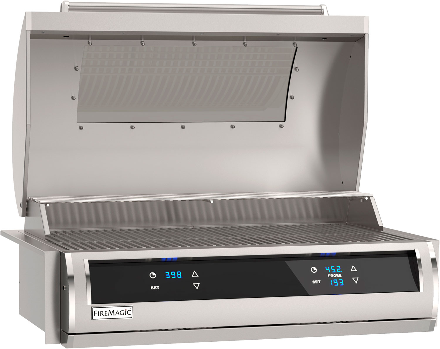 Der Fire Magic Echelon Elektrogrill bietet eine Bedienblende aus schwarzem Glas in welche die beiden digitalen Steuerungen der Thermostate eingelassen sind. Von hier aus können sie bequem sämtliche Temperatureinstellungen vornehmen, die Temperatur des Garraums und die Kerntemperatur im Blick behalten sowie sämtliche Einstellungen rund um Timer-/Alarmfunktion vornehmen.
