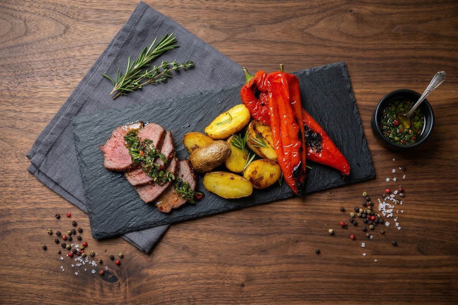 - Rinderhüfte mit selbstgemachter Chimichurri, Rosmarinkartoffeln und Spitzpaprika