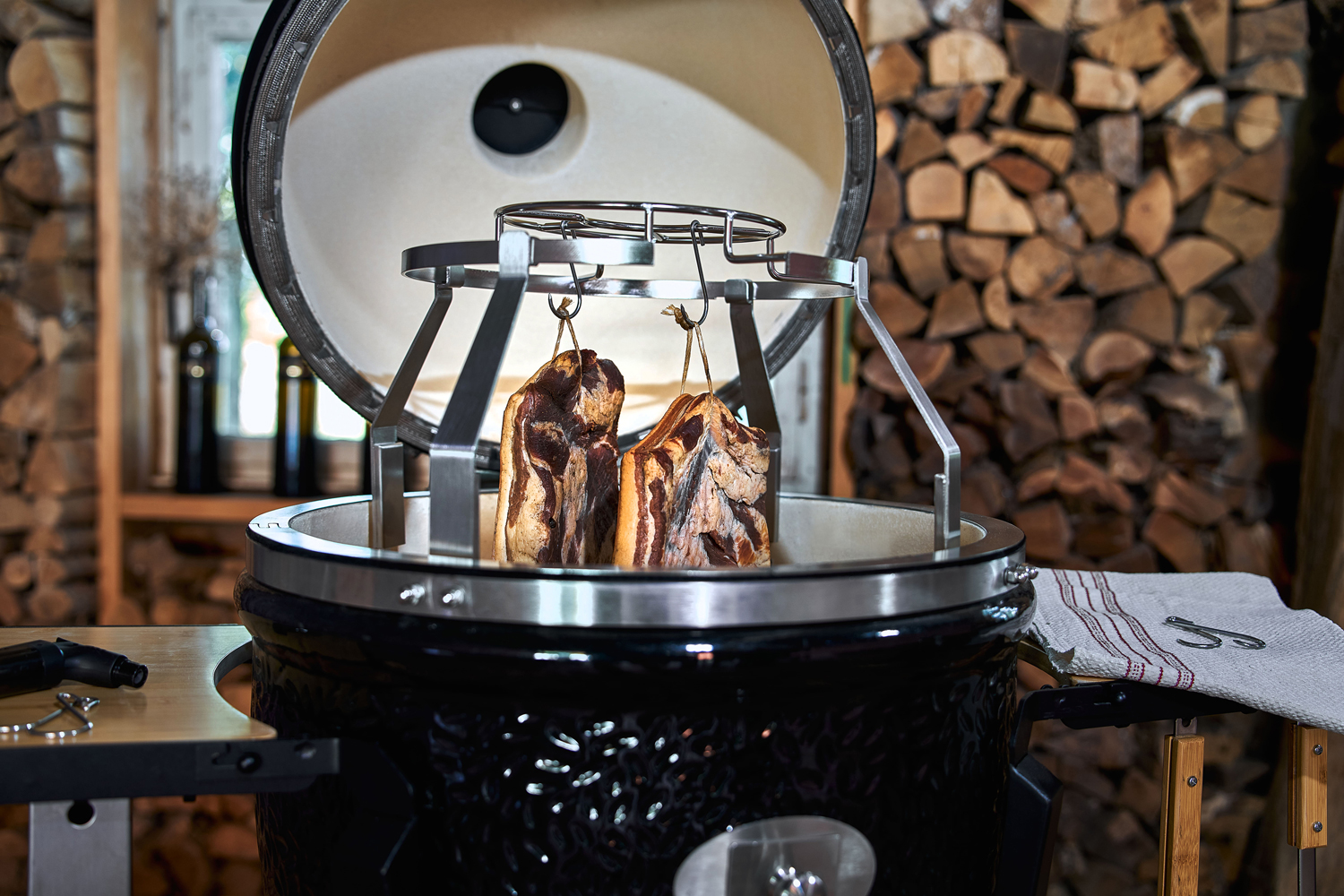 Die Anwendung ist ganz unkompliziert: Das stabile Räuchergestell aus langlebigem Edelstahl wird einfach mit vier Steck-Beinen auf das Monolith SGS-System aufgesetzt und schafft zusätzliche Höhe, um zum Beispiel ganze Forellen, Pastrami, Speck, Würste oder Käse komfortabel aufhängen zu können. Dazu sind bereits 6 stabile Edelstahlhaken im Set enthalten.