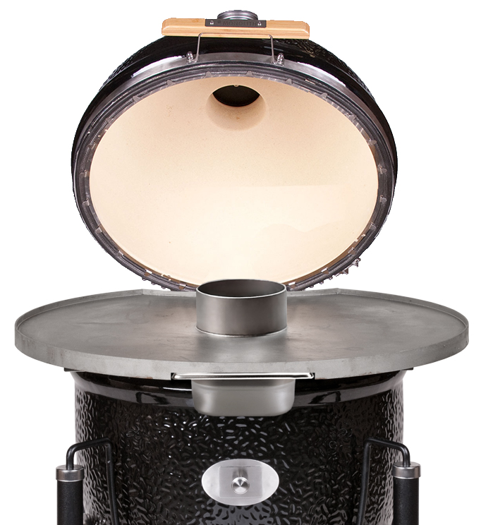 In der Mitte der Platte lässt sich der Ventildeckel des Grills installieren, um auch weiterhin die Temperatur perfekt regulieren zu können. Auf der Rückseite der Platte befindet sich eine Aussparung, so dass der Deckel des Keramikgrills nicht demontiert werden muss.