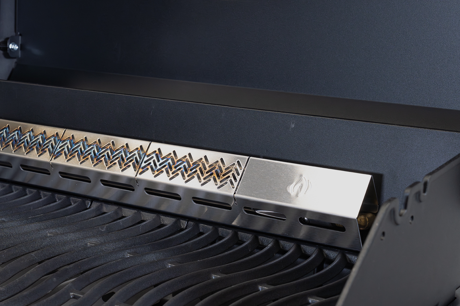 Die Edelstahl Flammenverteiler unterhalb der Grillroste sind zweistufig im Brennraum angeordnet. Das bedeutet, dass nicht nur direkt über jedem Brenner ein Flammenschutzblech sitzt, sondern auch dazwischen in den Zwischenräumen. Zudem sind die zusätzlichen Flammenverteiler von hinten nach vorne aufsteigend positioniert. Dadurch werden sogenannte Hotspots auf der Grillfläche verhindert. Die Hitze wird durch die Flammenschutzbleche gleichmäßig auf der gesamten Grillfläche verteilt. Auch das spezielle Alu-Druckguss-Brennergehäuse trägt zu einer gleichbleibenden Temperatur effektiv bei.