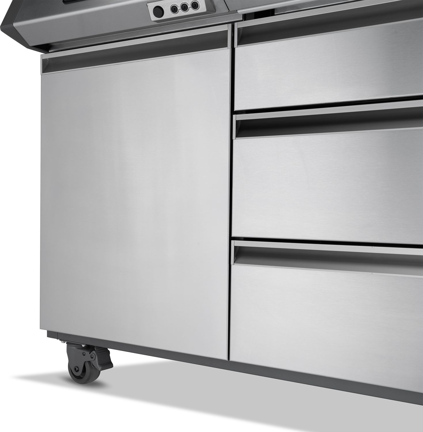 Der Prestige PRO665VX ist im Vergleich zum PRO500VX mit weiteren besonderen Highlights ausgestattet. Als Flaggschiff der Serie bietet er zusätzlich eine bereits integrierte elektrische Räucherbox, welche mit Hilfe von einem Gebläse die Garkammer mit feinem Rauch versorgt. Der Unterschrank selbst ist mit 3 XL Schubladen, einem Apothekerauszug sowie einem beleuchteten Gasflaschenschrank mit herausziehbarer Gasflaschenwaage ausgestattet. Die Fettauffangwanne ist eingebettet in einen komfortablen Soft-Close-Auszug, wodurch die Wanne noch einfach entnommen werden kann.