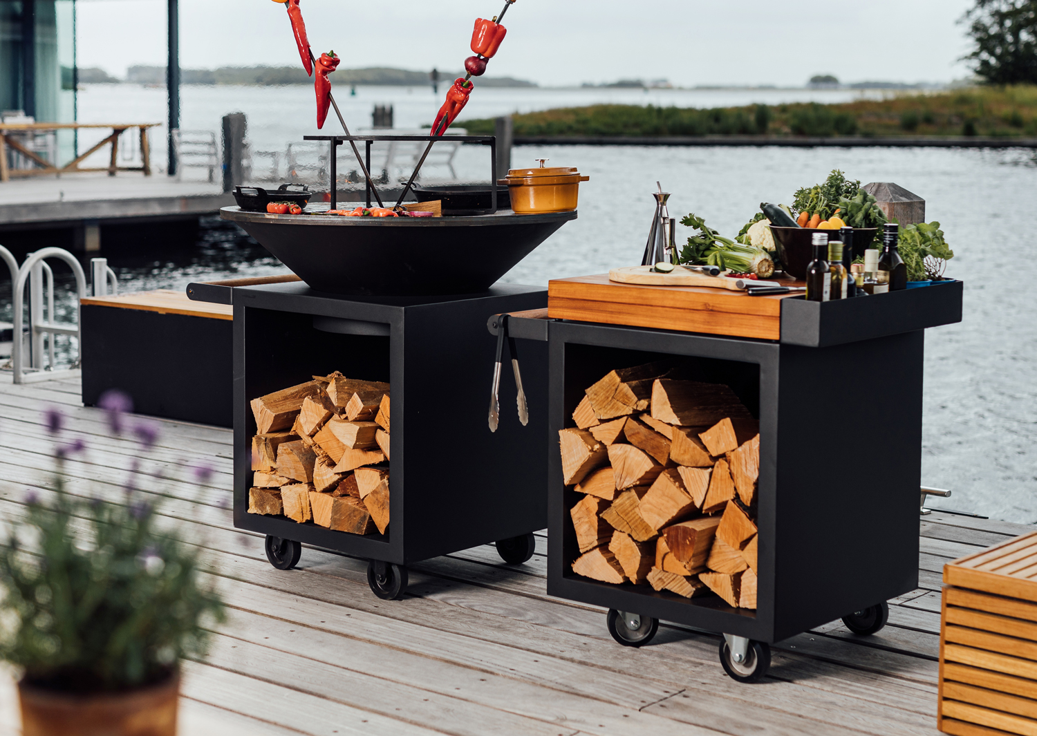 Ausgestattet mit einer extra massiven Teakholz Arbeitsplatte, einem großzügigen Lagerfach im Sockel und einem praktischen Behälter für Soßen, Besteck und Kräuter ist die OFYR Mise en Place Table ideal als zentraler Arbeitsplatz der Outdoor-Küche.