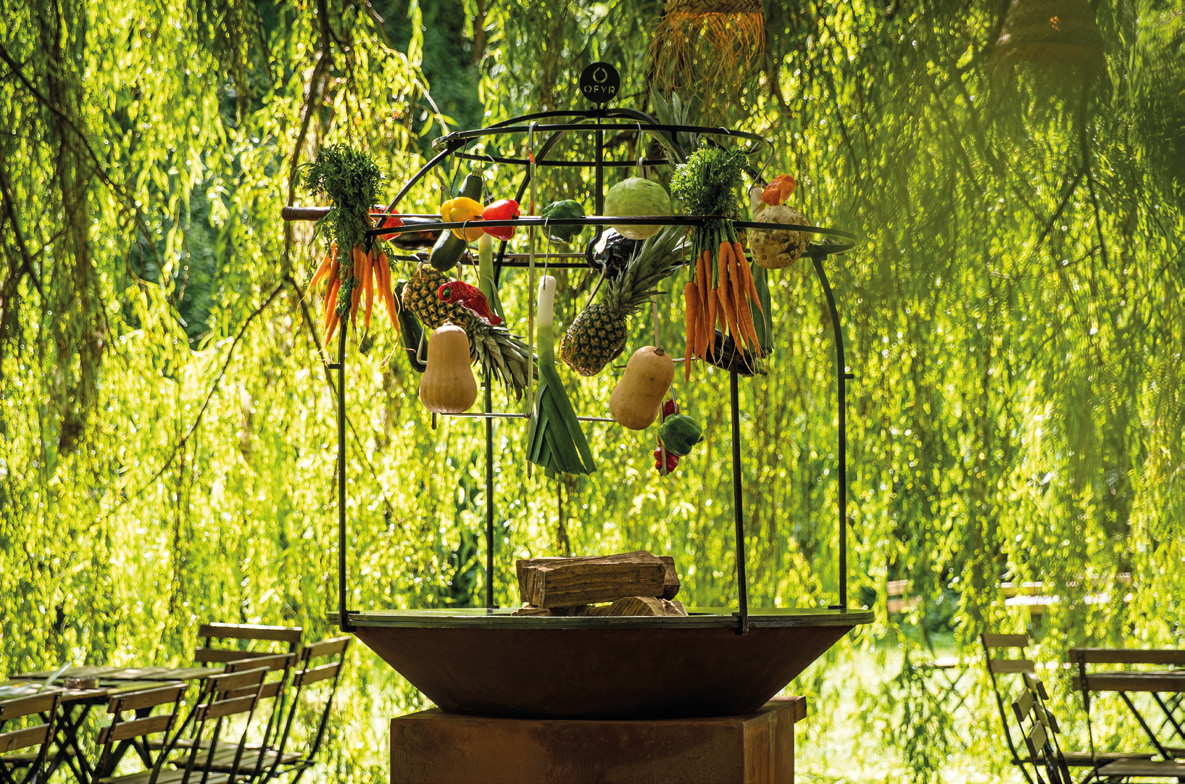 Mit dem OFYR Cage 120 wird das Grillen auf der Feuerplatte zum spektakulären Show-Effekt: Die kuppelförmige Erweiterung wird am äußeren Rand der Feuerplatte montiert, um an den Stangen die Zutaten wie Fleisch, Fisch, Gemüse oder Obst aufzuhängen und langsam in der Wärme des Feuers garen zu lassen.