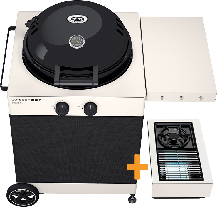 Mit der im Set beiliegenden Blazing-/Cooking Zone bekommt der Arosa ein ganz besonderes Upgrade verpasst! Das Anbaumodul mit Infrarotbrenner und Seitenkocher erweitert die Zubereitungsmöglichkeiten um ein Vielfaches und sorgt für ein noch größeres Temperaturspektrum von 80°C - 900°C.