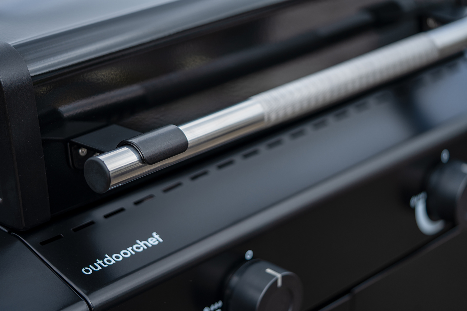 Für maximale Mobilität ist die Grillstation mit hochwertigen Edelstahl-Rollen ausgestattet, von denen zwei über eine Feststellbremse verfügen – leichtgängig beim Verschieben, absolut sicher im Stand. Die beleuchteten Drehregler mit Safety Light erhöhen den Bedienkomfort und sorgen jederzeit für klare Rückmeldung über den Betriebszustand der Brenner (an/aus).