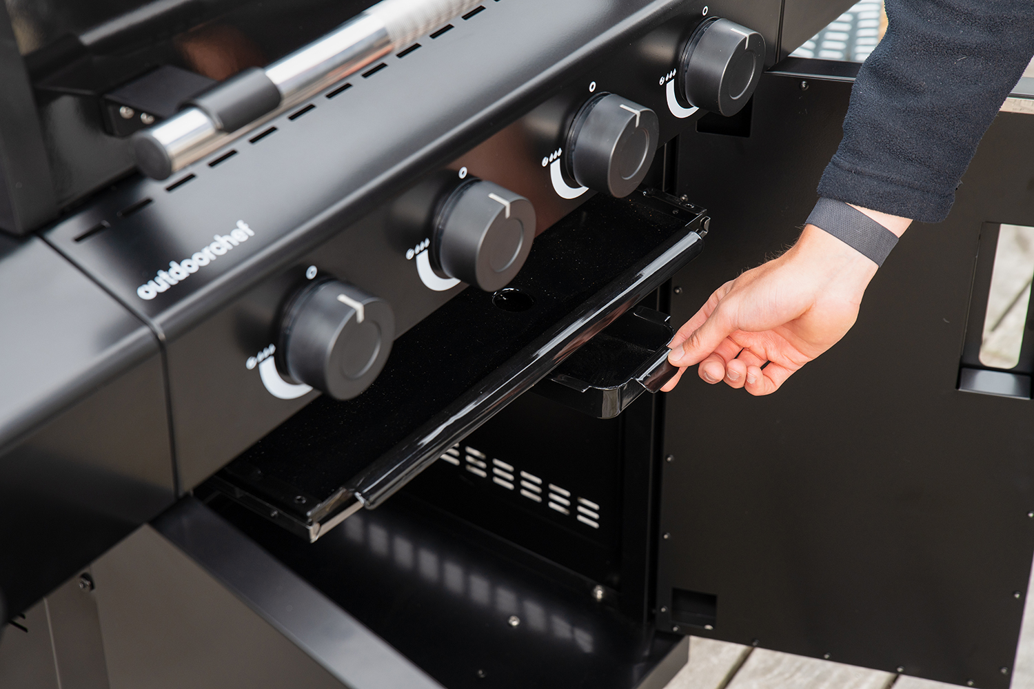 Auch im täglichen Einsatz überzeugt der Outdoorchef HEAT C-435 RB mit einem durchdachten Gesamtkonzept. Der geräumige Unterschrank bietet Platz für Gasflaschen bis 11 kg und sorgt dank integrierter Halterung für einen sicheren Stand. Die fest montierten Seitenablagen sind besonders stabil ausgeführt und tragen mühelos schweres Grillzubehör, Pfannen oder Töpfe.