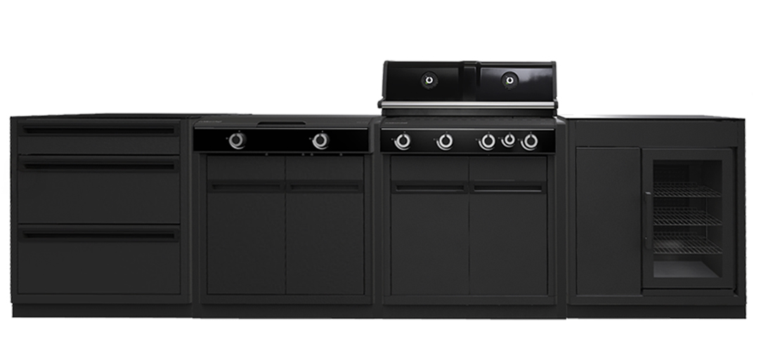 Die gesamte Küchenzeile besticht durch ihren modernen, zeitlosen Look: Schwarz pulverbeschichteter Edelstahl garantiert maximale Langlebigkeit und besten Schutz vor Witterungseinflüssen. Hochwertige Details wie Soft-Close-Türen und die elegante Sockelblende runden das Gesamtbild ab.