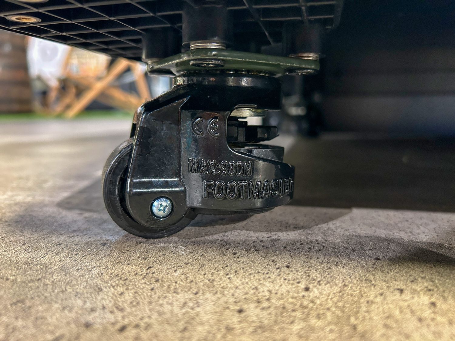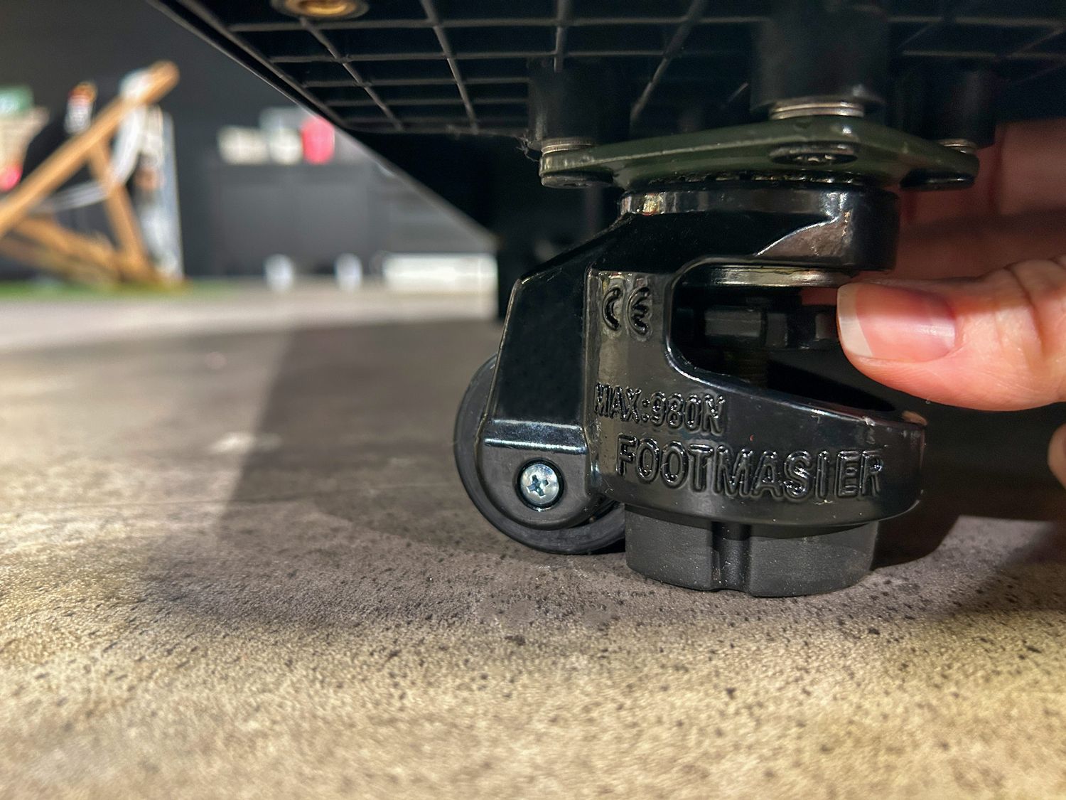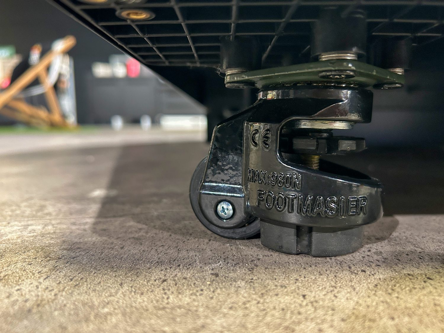 Alle HEAT Module besitzen jeweils 4 massive, höhenverstellbare Standfüße aus Gusseisen mit einer Schwerlastrolle aus Hartgummi (belastbar bis jeweils 50 kg). So kann jedes Modul optimal in der Höhe angepasst werden, bleibt aber dennoch mobil zum einfachen Transport der Küchenzeile. Für die Ausrichtung der Module und für einen rutschfesten Stand wird der Hartgummi-Standfuß der Rollen nach unten gedreht, bis die gewünschte Höhe erreicht ist. Die Befestigung der Rollen, mit jeweils einer Stahlplatte, sorgt für noch mehr Stabilität und ist besonders langlebig.