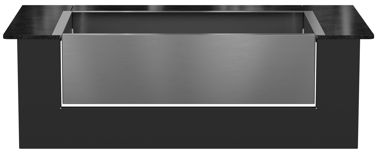 Das Einbauset besteht aus einem stabilen Edelstahlramen, einer Frontblende aus schwarz pulverbeschichtetem Edelstahl, zwei Abdeckungen aus poliertem, schwarzem Granit und allen notwendigen Montagematerialien.
