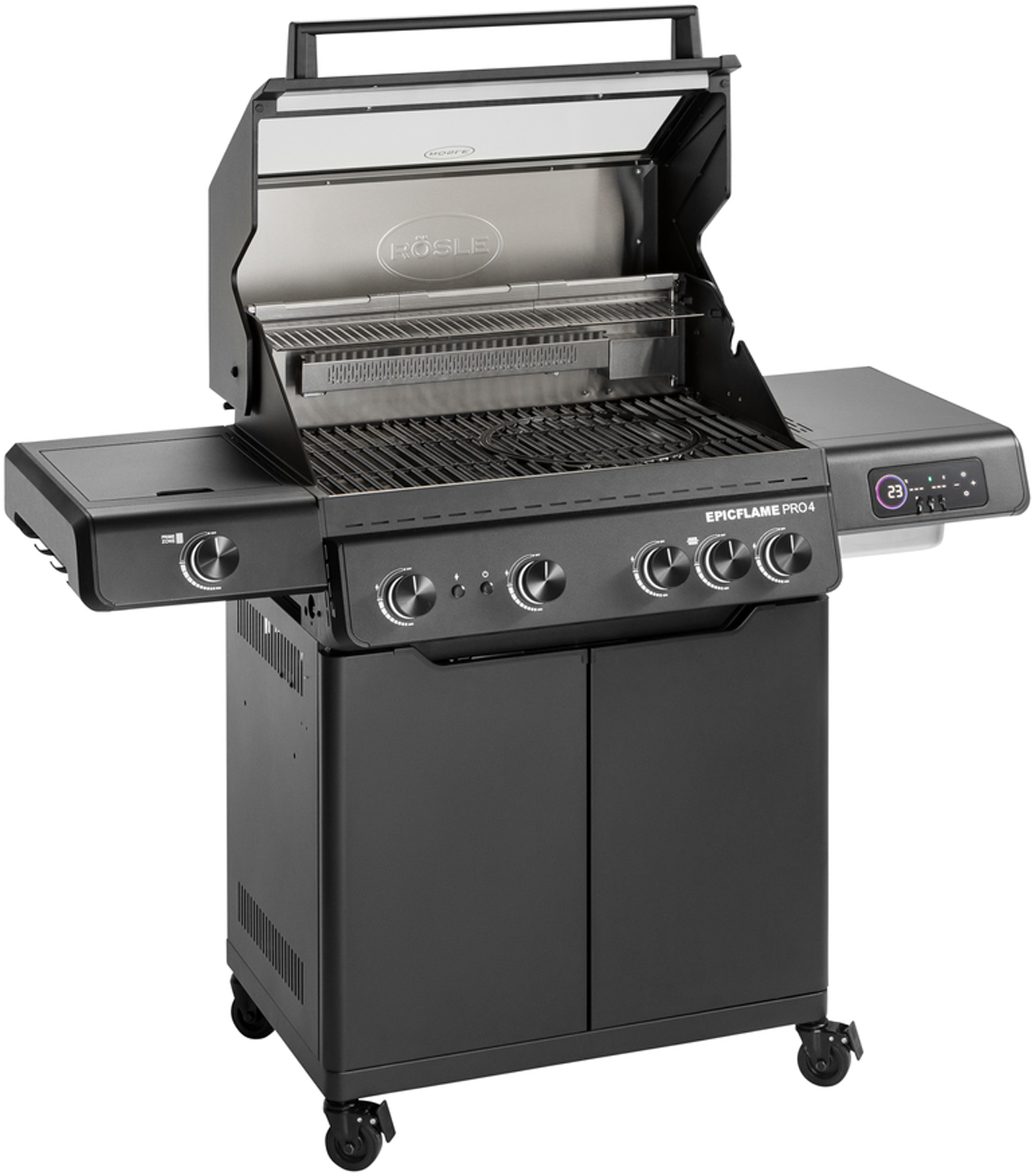 Der Rösle EPICFLAME PRO 4 ist die leistungsstarke Erweiterung der EPICFLAME Serie für alle, die maximale Performance, großzügige Grillfläche und volle Ausstattung erwarten. Ausgestattet mit 4 HEATSPIRE Hauptbrennern, XL PRIMEZONE, integriertem Backburner und digitalem Grillthermometer mit App-Anbindung, liefert dieser 4 Brenner Gasgrill kompromisslose Power für direktes und indirektes Grillen auf höchstem Niveau.