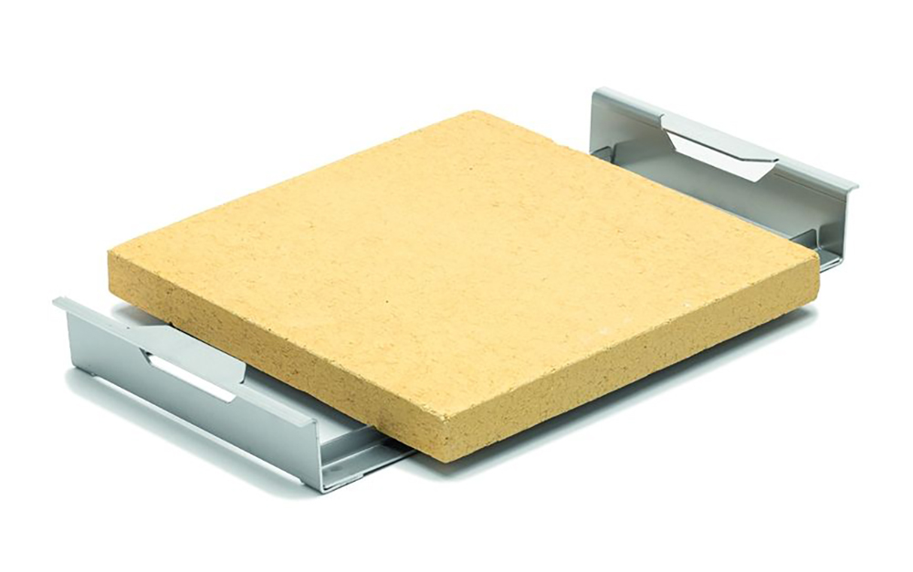 Der Stein besteht aus 3 cm starkem Schamott. Das Material ist nicht nur ein sehr guter Wärmespeicher, sondern sorgt mit seiner porösen Struktur dafür, dass der Pizzateig schön knusprig wird.