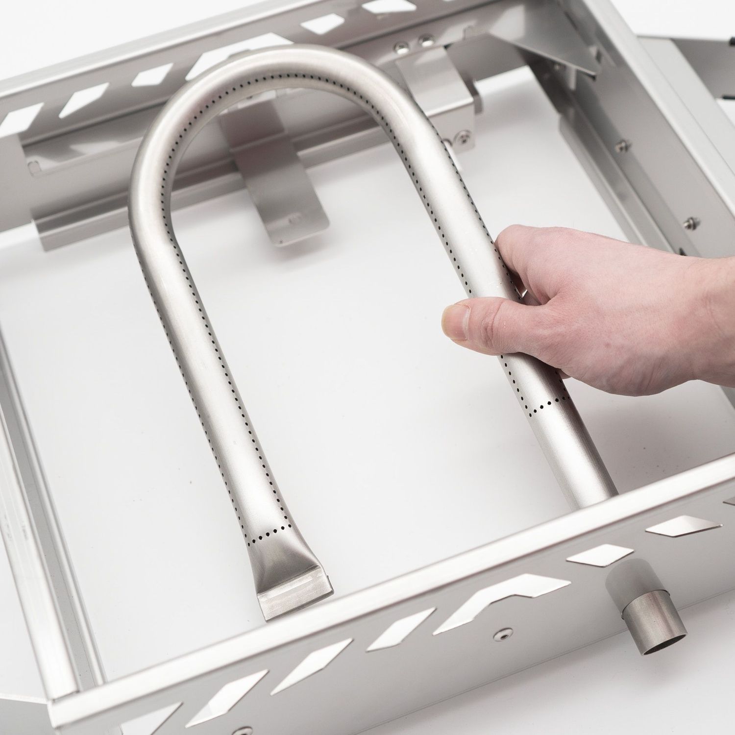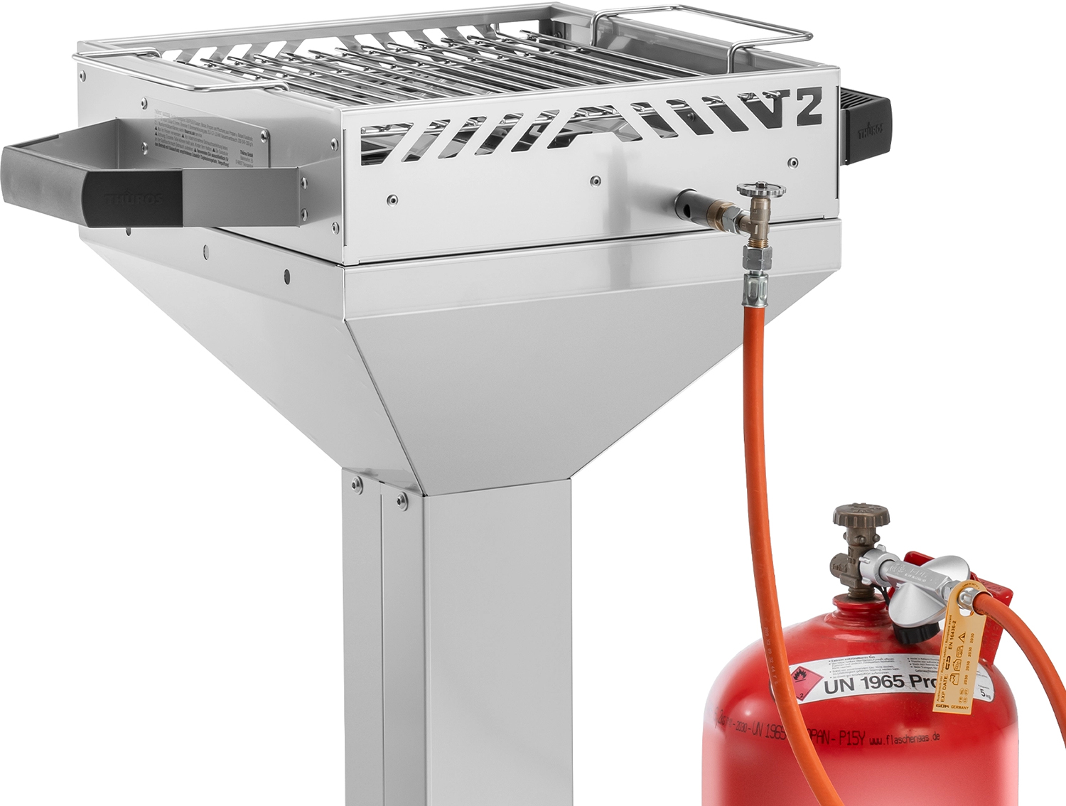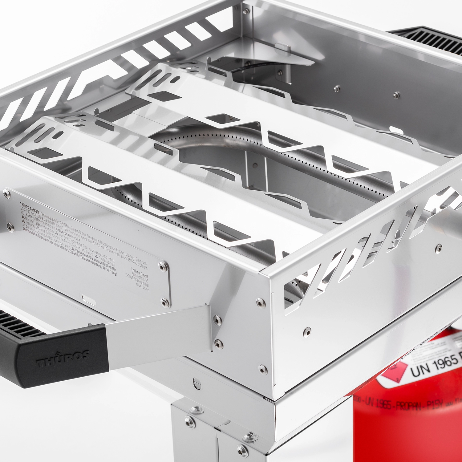 Wie von Thüros gewohnt, bestehen Rahmen, Brennerrohr, Flammschutzbleche und Fettauffangschale aus hochlegiertem, antimagnetischem V2A-Edelstahl. Dies sichert eine extrem lange Haltbarkeit und eine einfache Pflege. Zur Reinigung lassen sich alle Teile inklusive des Brennerrohrs ganz ohne Werkzeug entnehmen.
