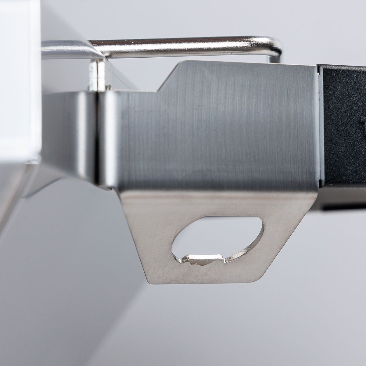 - Praktische Extras: Links mit Haken zum Befestigen von Zubehör und rechts mit Flaschenöffner ausgestattet.