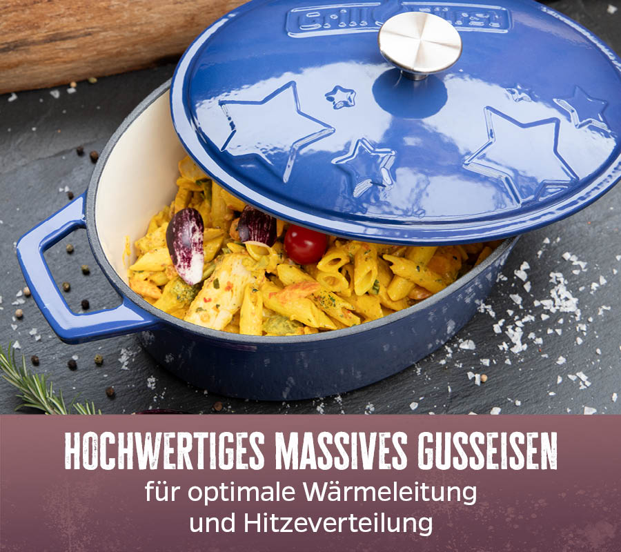 Den saftigen Sonntagsbraten im Ofen schmoren, zartes Gulasch am Herd köcheln oder deftige Rouladen am Grill braten: das Sternentöpfchen kann Alles! Die ovale Form des Gusseisen Bräters bietet eine große Fläche zum Anbraten, während er danach platzsparend auf der Grillfläche oder im Ofen platziert werden kann.